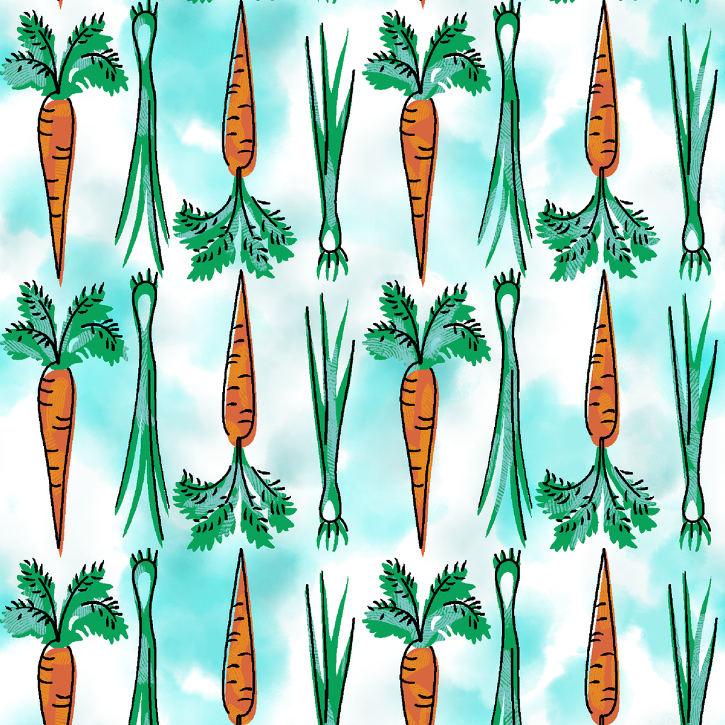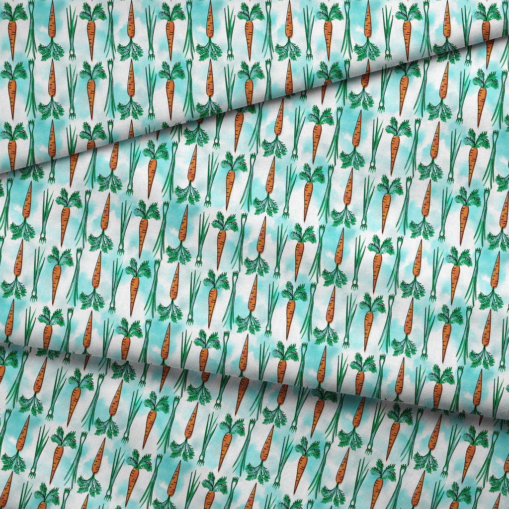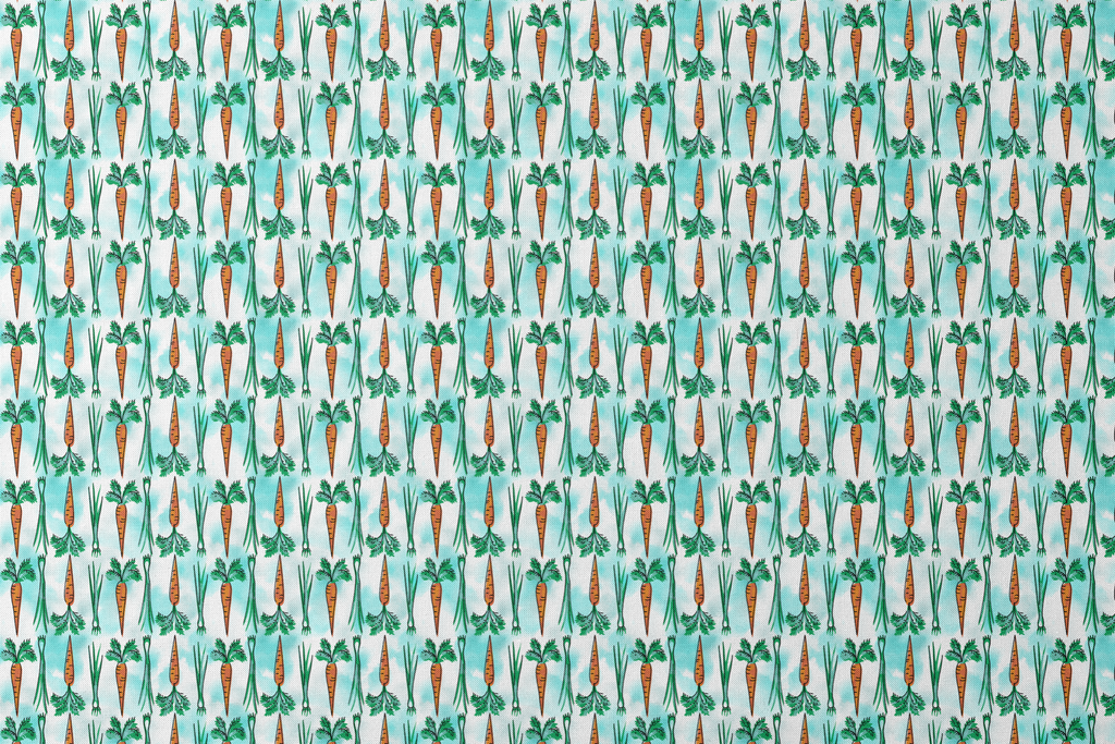 Vibrant orange carrots with fresh green tops create a playful botanical pattern on a light turquoise background, perfect for kitchen decor or culinary-themed projects.