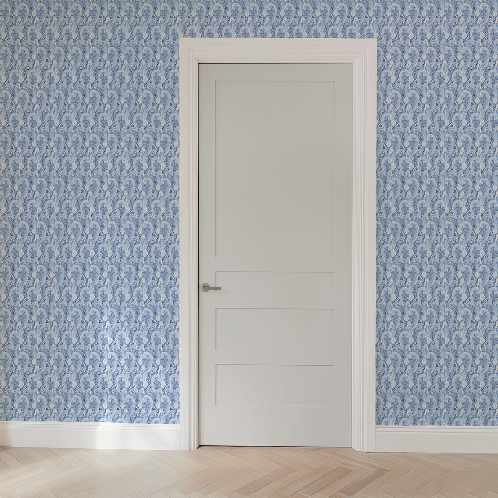 Elegant paisley pattern in tranquil blue and white featuring flowing botanical motifs with delicate swirls and organic shapes - perfect for adding a classic, timeless appeal to any space.