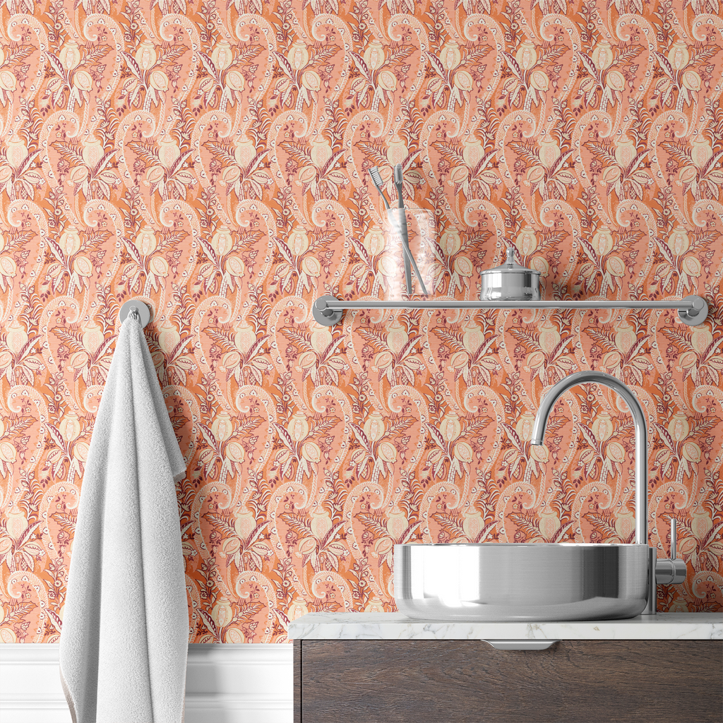 Elegant paisley print in warm peach tones with flowing botanical motifs and intricate swirls creates a sophisticated pattern perfect for any space.