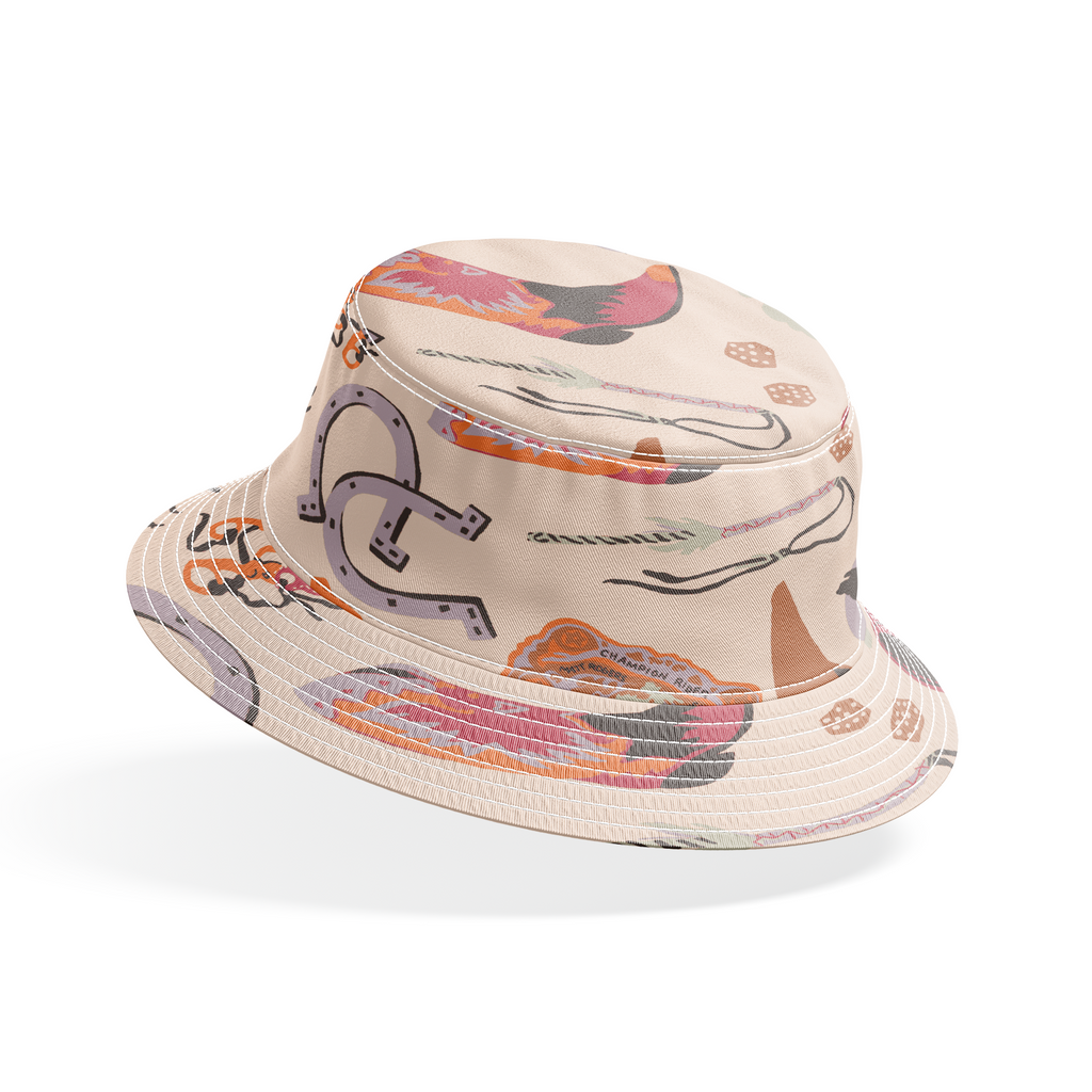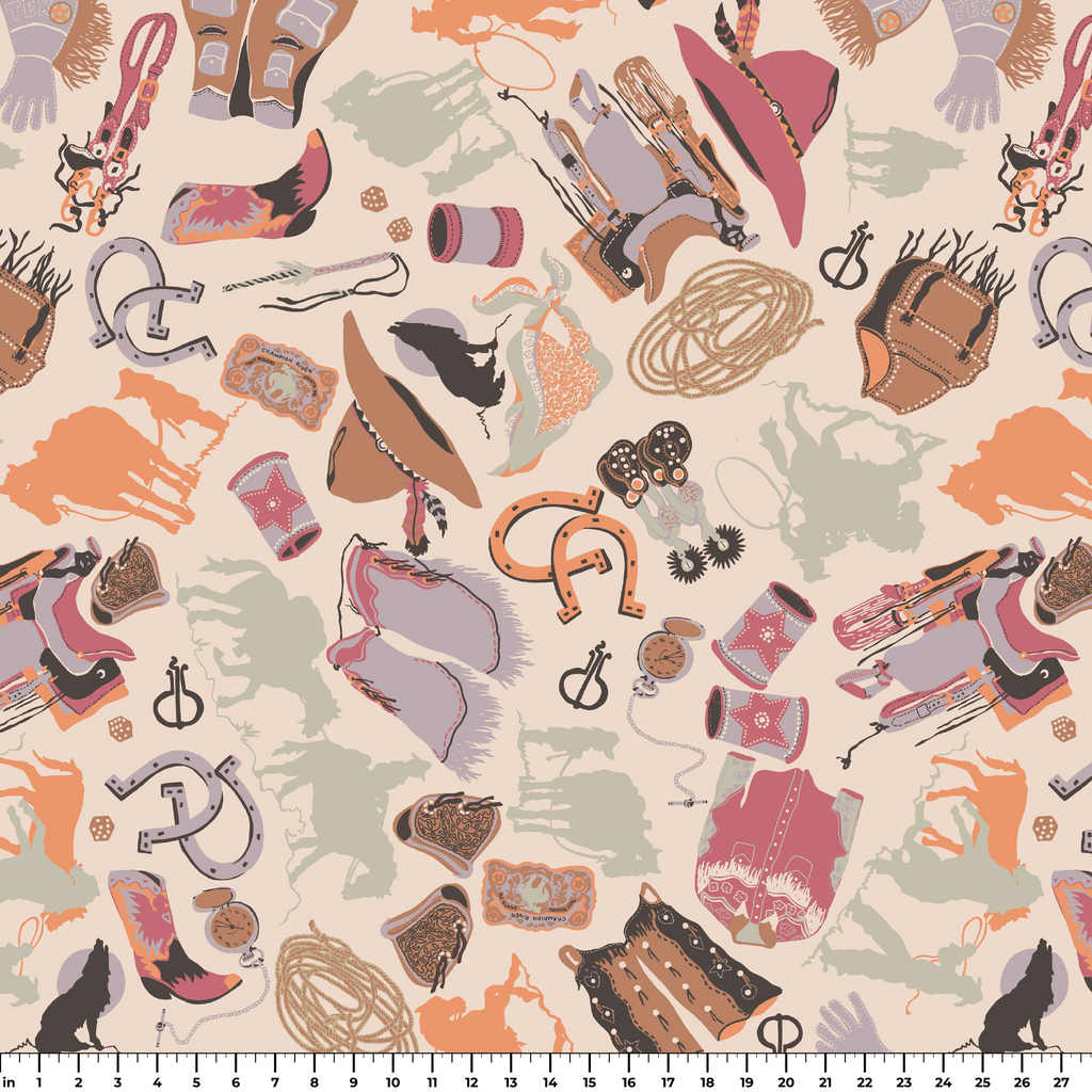 This vintage fashion pattern features shoes, boots, hats, and accessories in soft earth tones and muted pastels for a nostalgic retro look perfect for home decor projects.