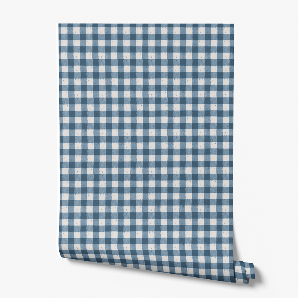 Blue and white gingham plaid pattern with vintage watercolor, perfect for modern farmhouse style.