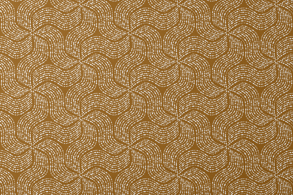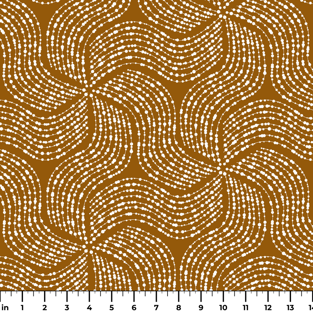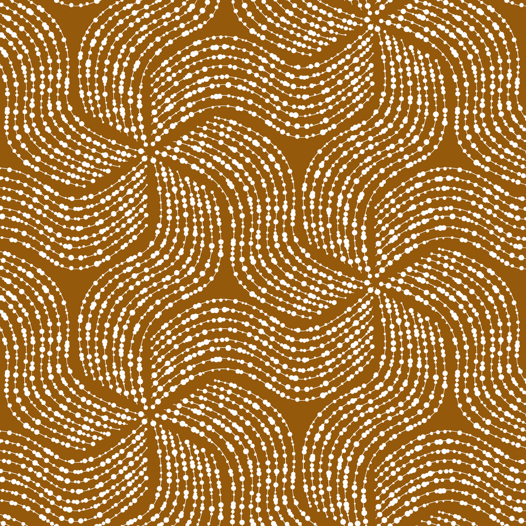 Golden brown swirling dots create mesmerizing wave patterns in this retro-inspired geometric design with flowing curves and rhythmic movement.