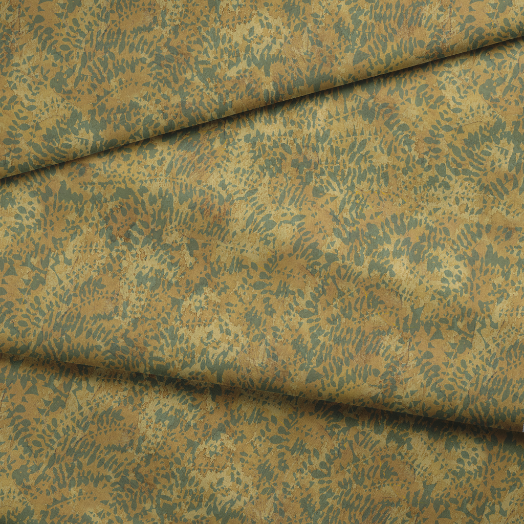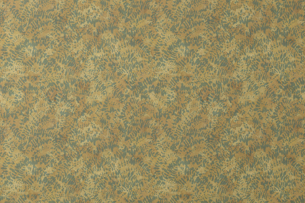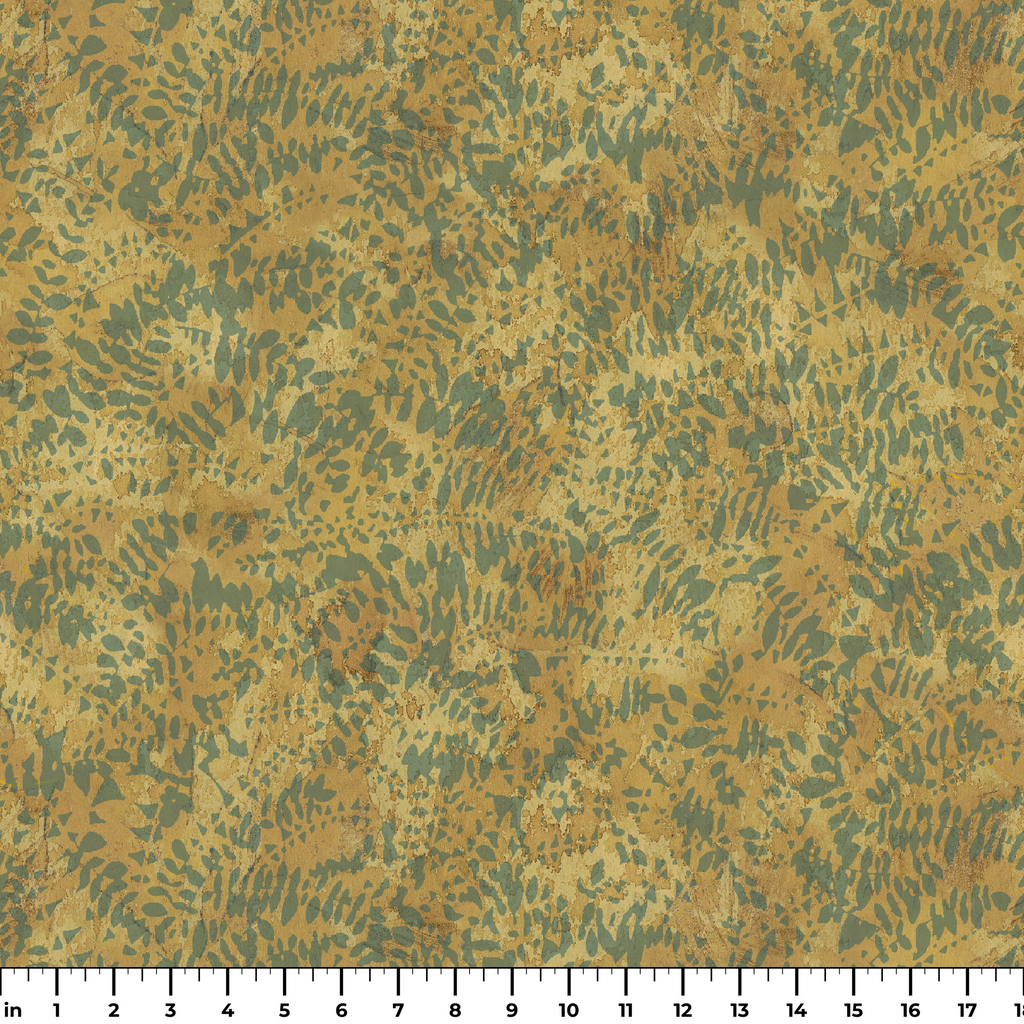 Sophisticated batik-inspired fabric pattern in earthy gold and sage green tones, featuring delicate fern-like designs perfect for home décor or quilting projects.