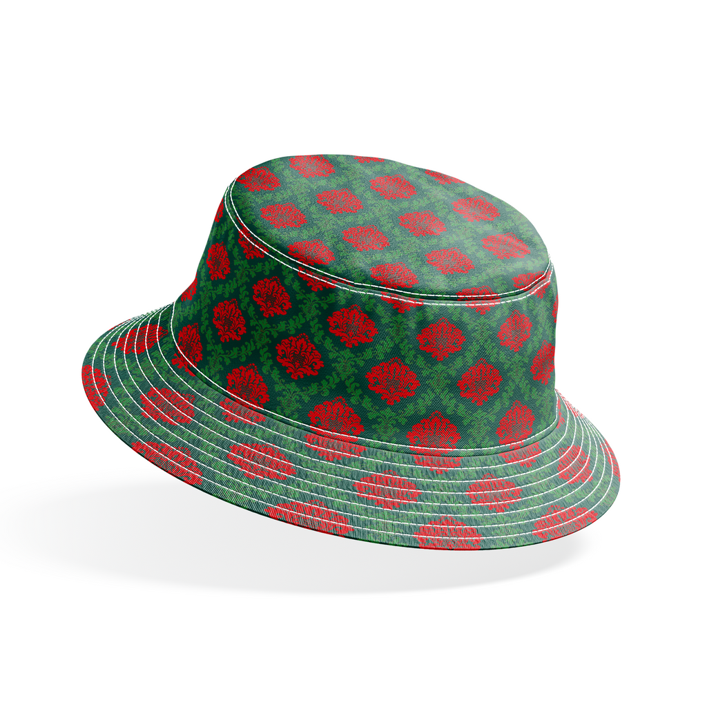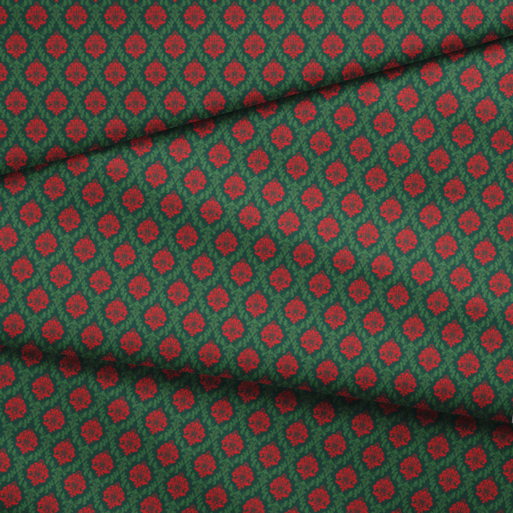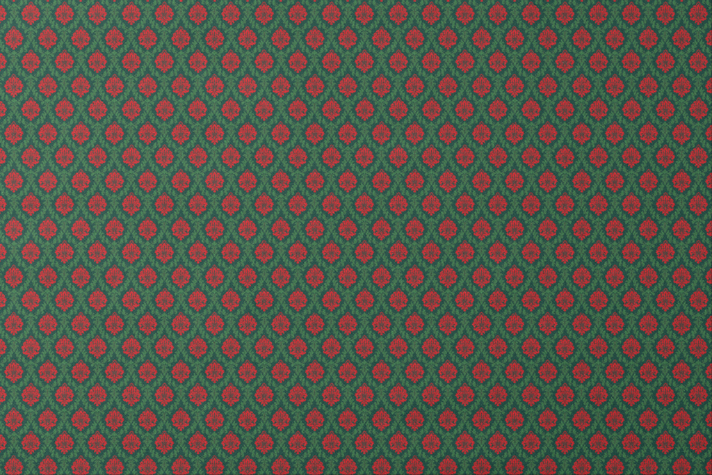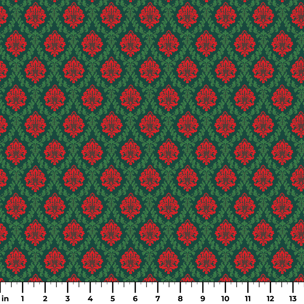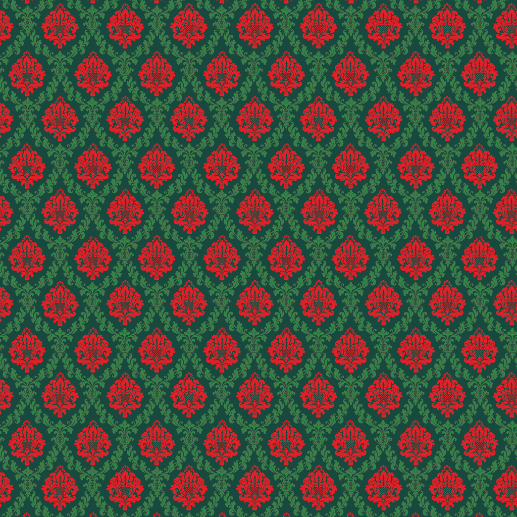 Classic green damask pattern featuring red elegant floral motifs in a traditional design. Perfect for seasonal heritage-inspired home decor and crafts.