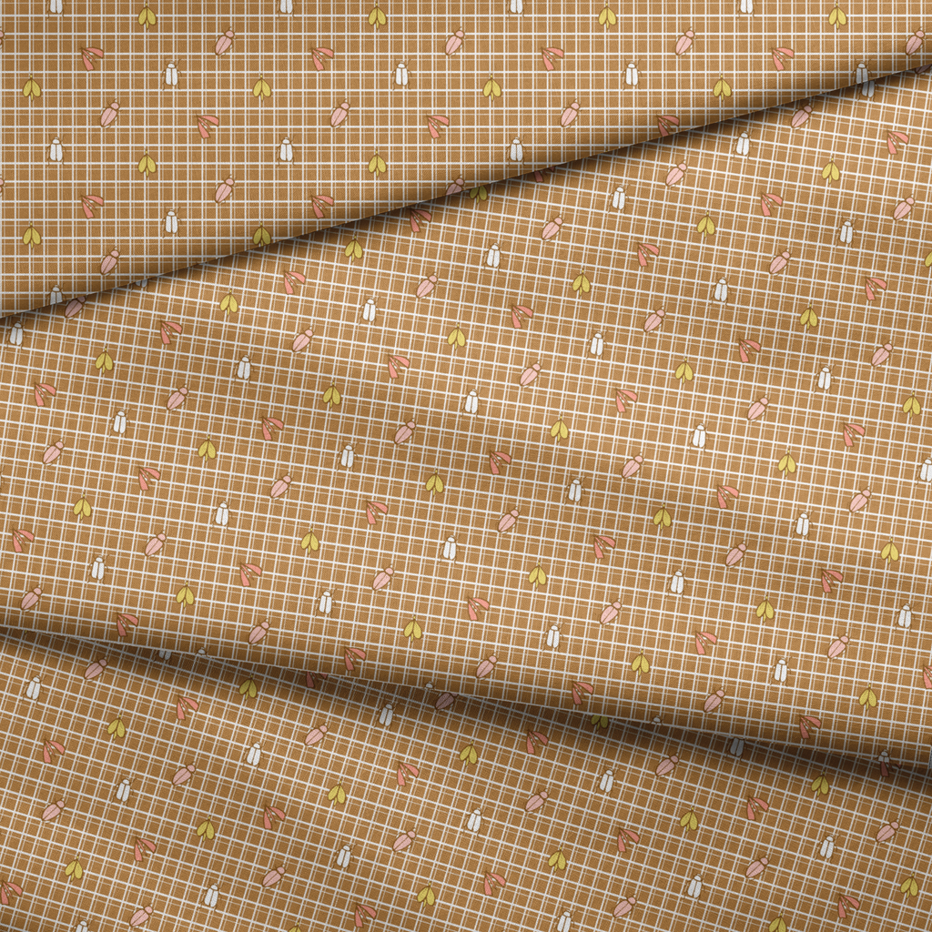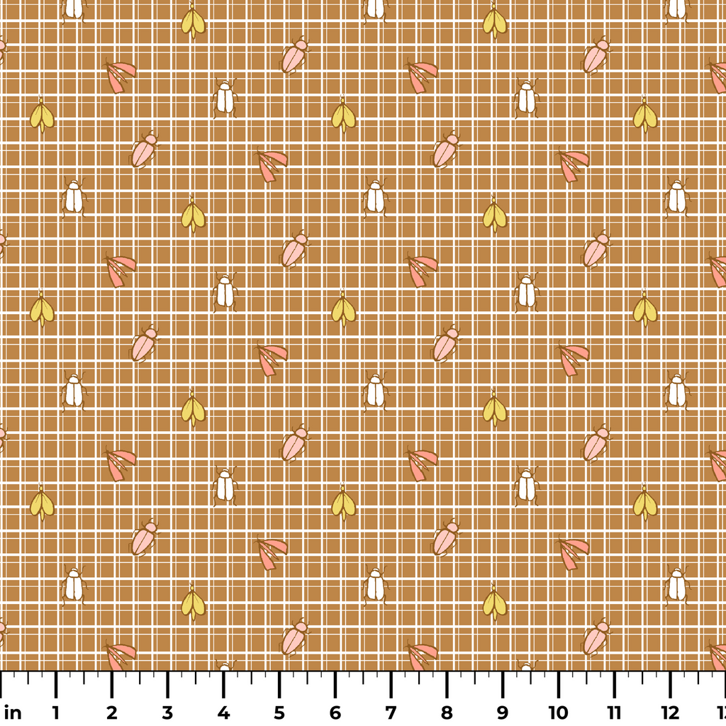 Cute bugs and beetles scattered on a brown gingham check pattern featuring whimsical insects in yellow and red tones for a charming aesthetic.