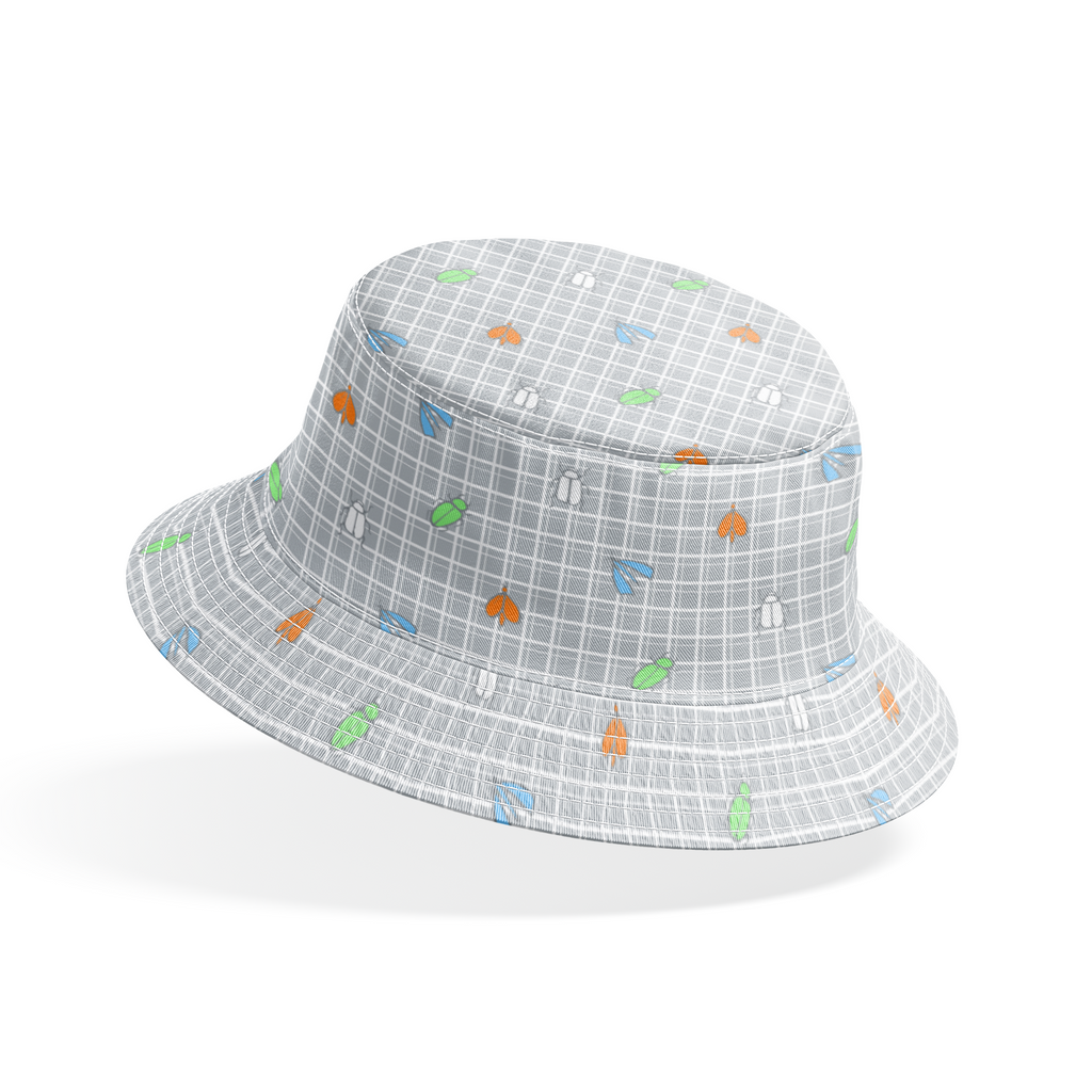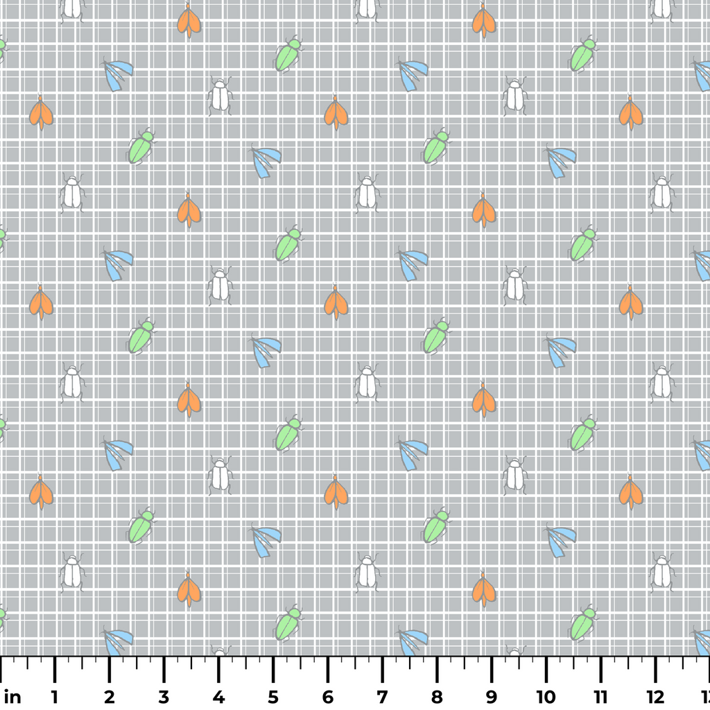 Cute bugs and beetles scattered on a gray gingham check pattern featuring whimsical insects in green, blue, and orange tones for a charming aesthetic.