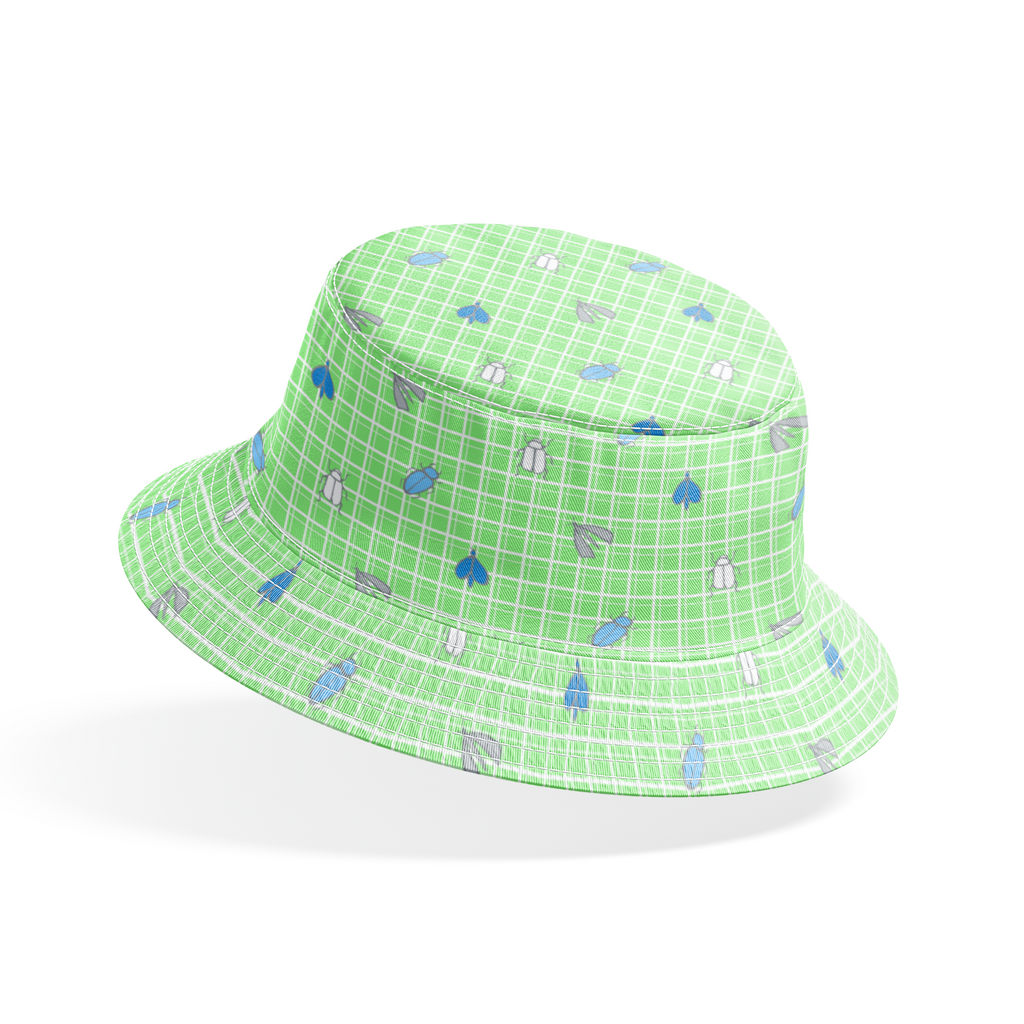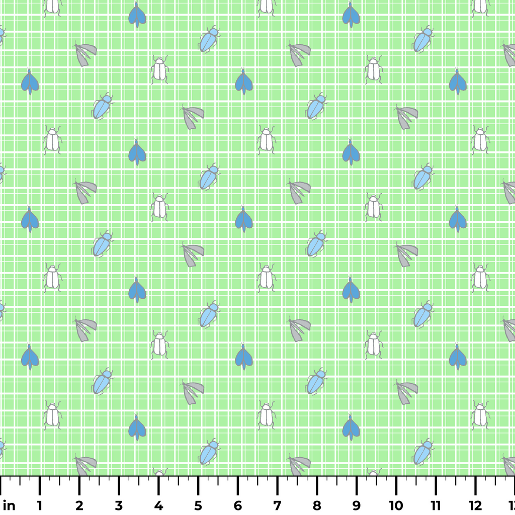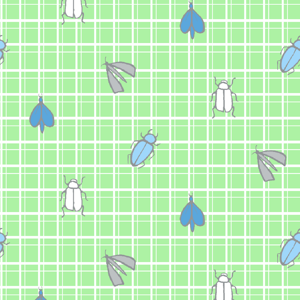 Cute bugs and beetles scattered on a green gingham check pattern featuring whimsical insects in soft blue and gray tones for a charming aesthetic.