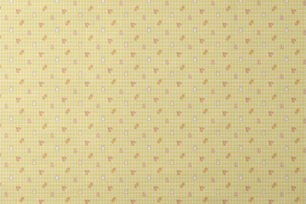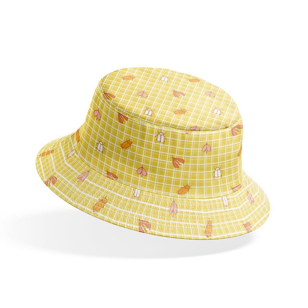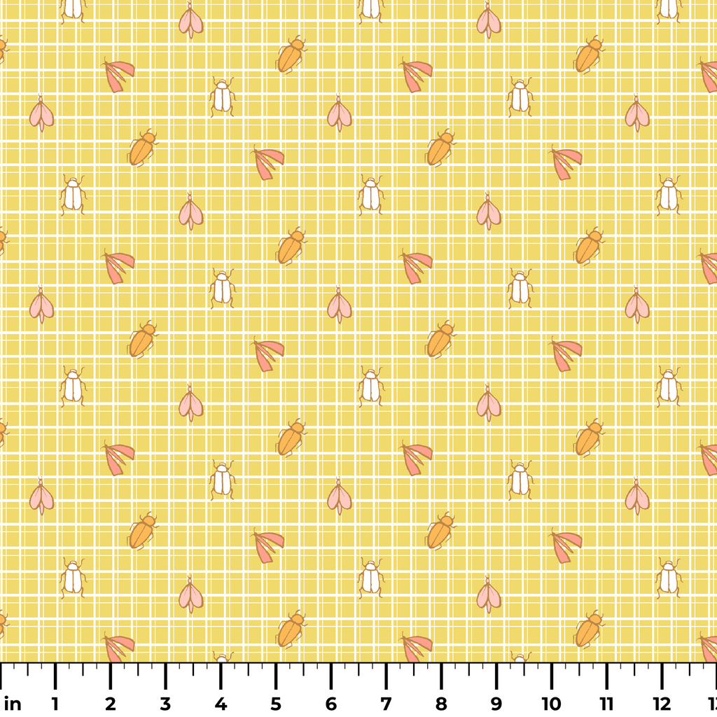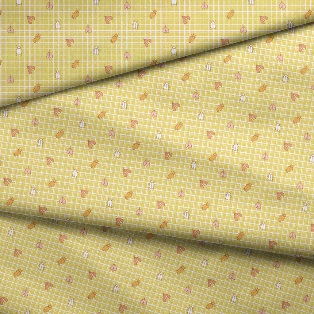 Cute bugs and beetles scattered on a yellow gingham check pattern featuring whimsical insects in orange and red tones for a charming aesthetic.