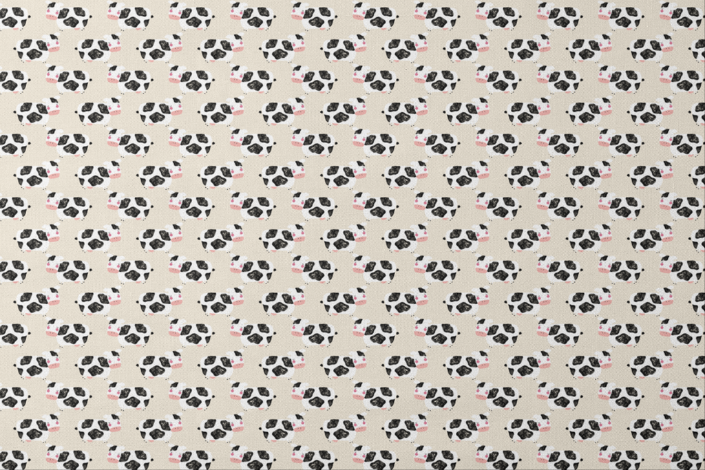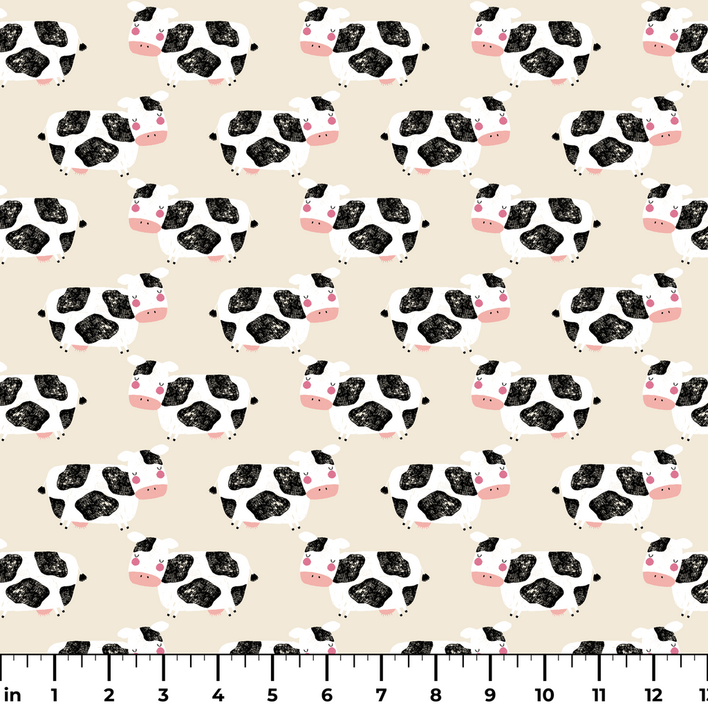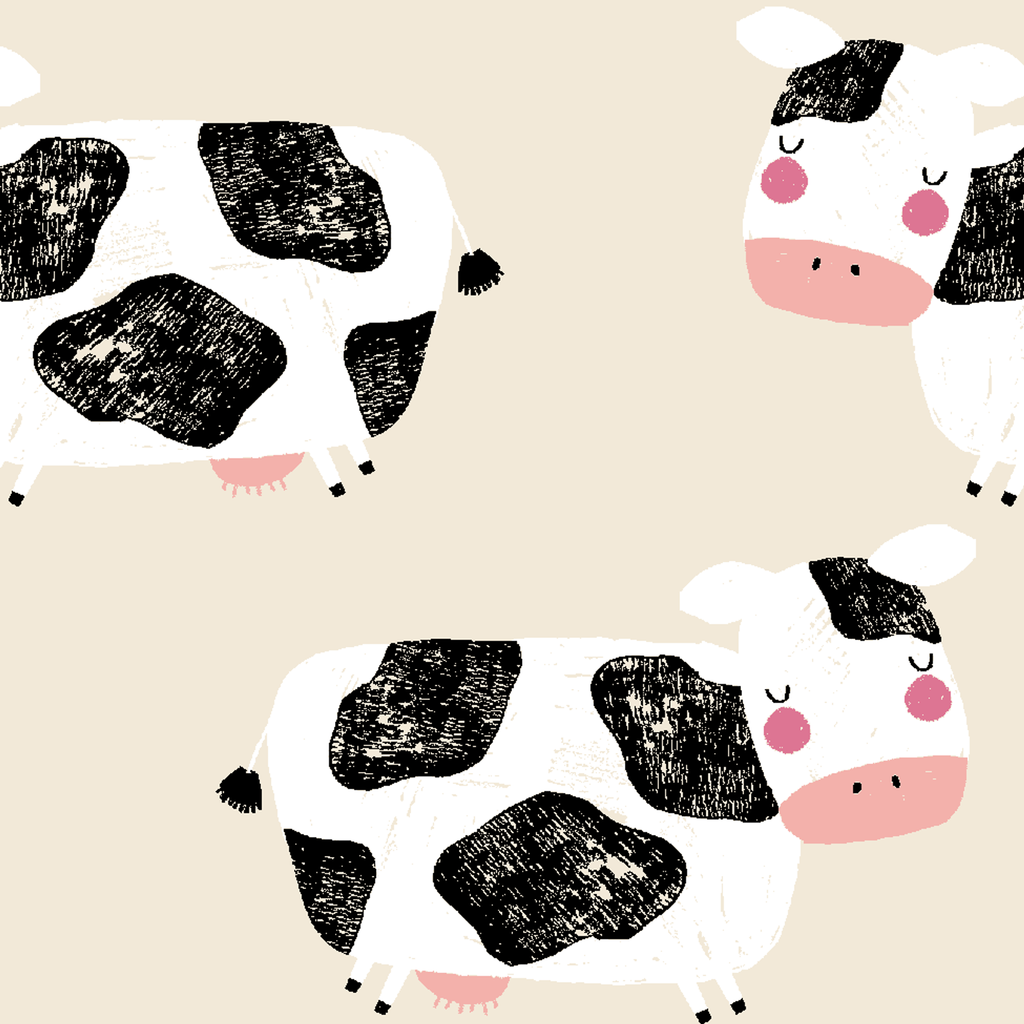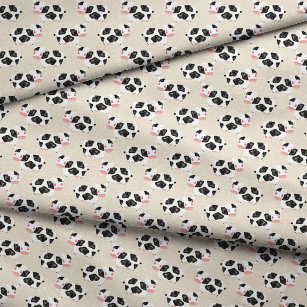 Adorable cartoon cows with textured black spots on a neutral beige background. This whimsical farm animal pattern features cute pink cheeks and sweet expressions perfect for nursery decor or children's apparel.