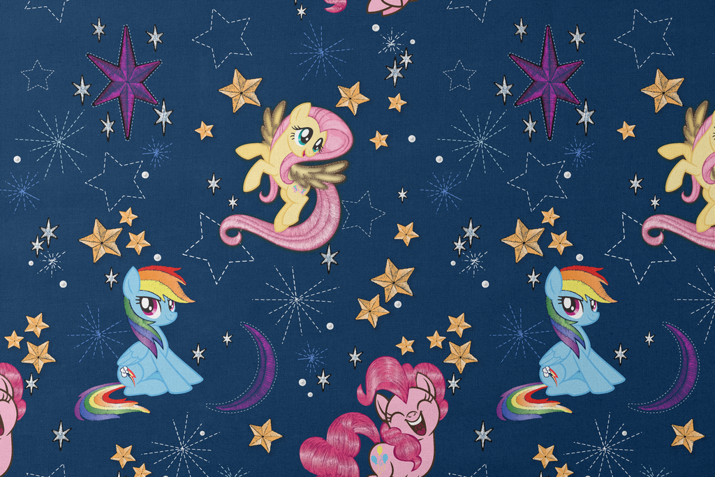This delightful Hasbro My Little Pony pattern features colorful ponies on a deep blue starry background with golden stars and celestial motifs. Perfect for fans of the magical friendship series.