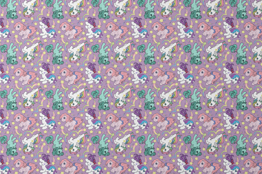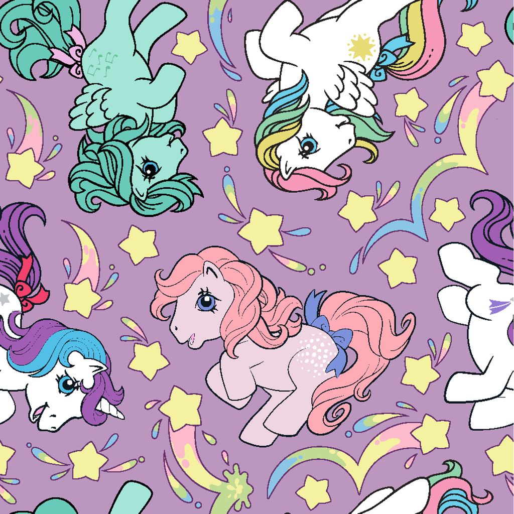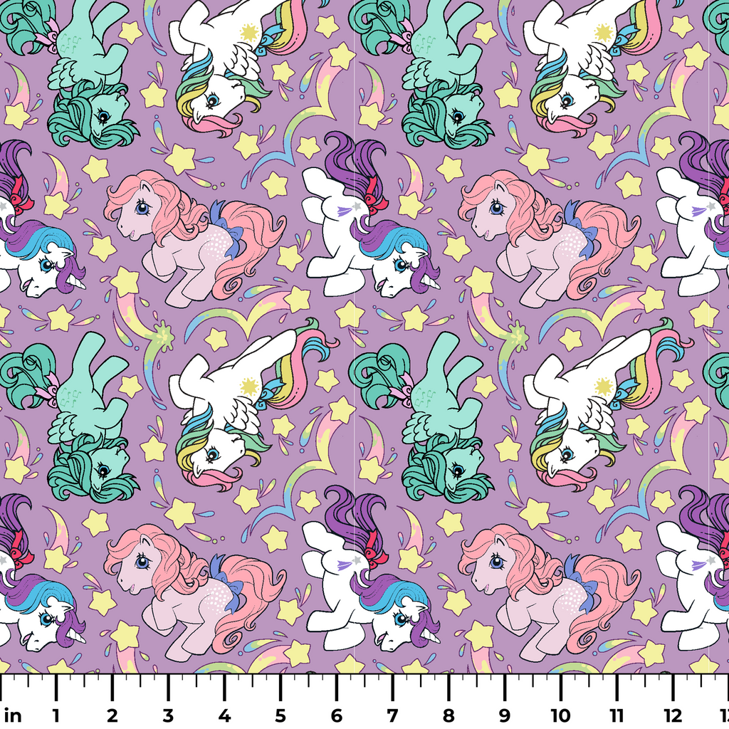 Magical Hasbro My Little Pony with whimsical ponies in pastel pink, mint green, and lavender on a purple background with sparkling stars and dreamy swirls. Perfect for kids decor.