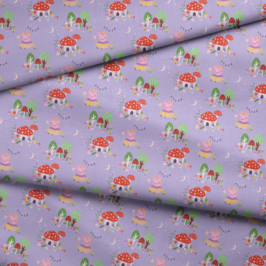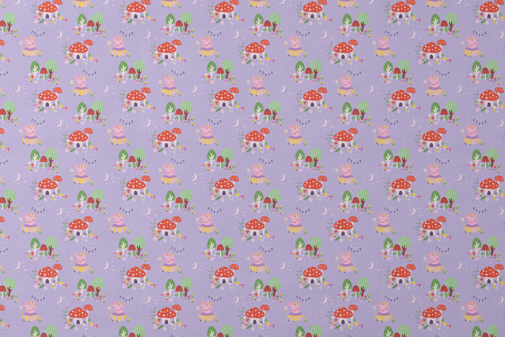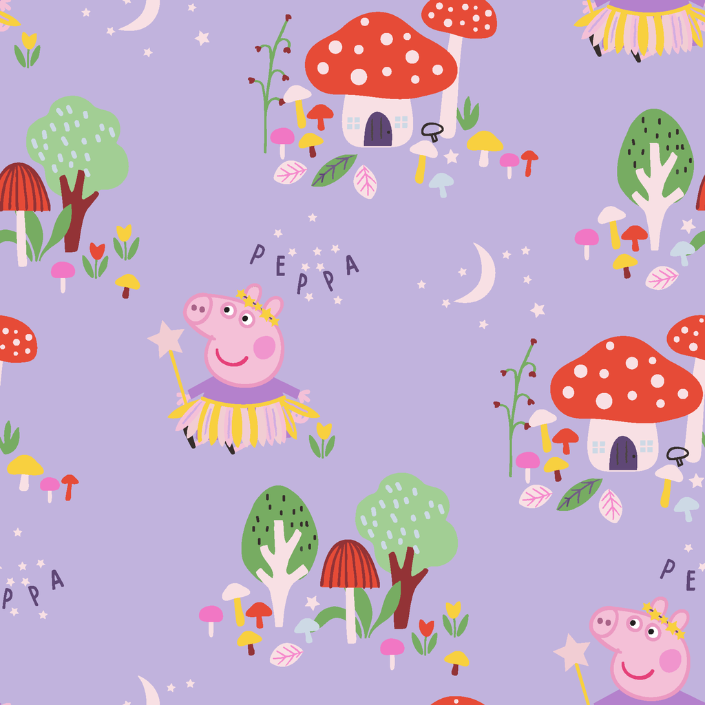 Adorable Hasbro Peppa Pig fairyland featuring magical mushroom houses, trees, and flowers on a lavender background - perfect for your little one's bedroom decor or craft projects.