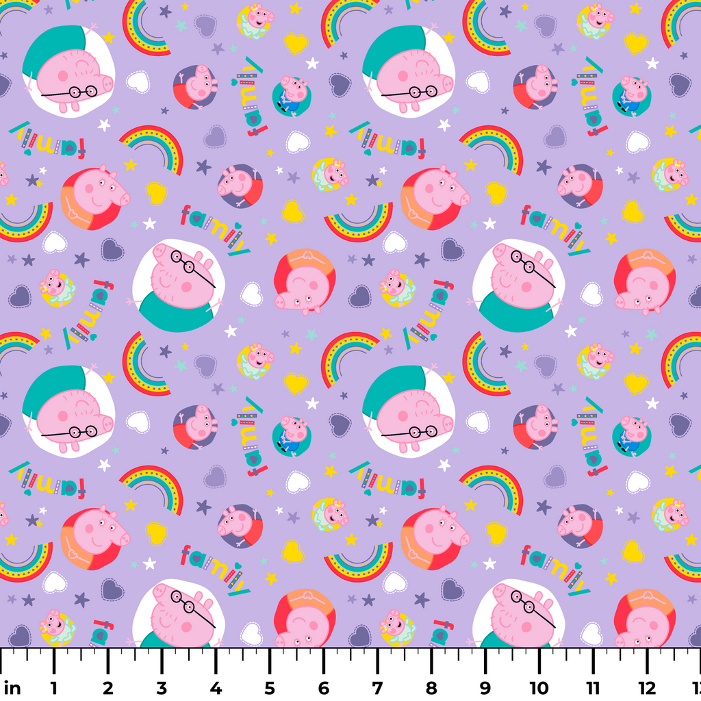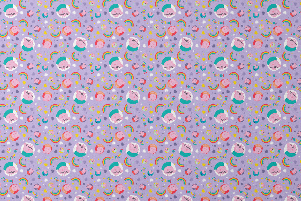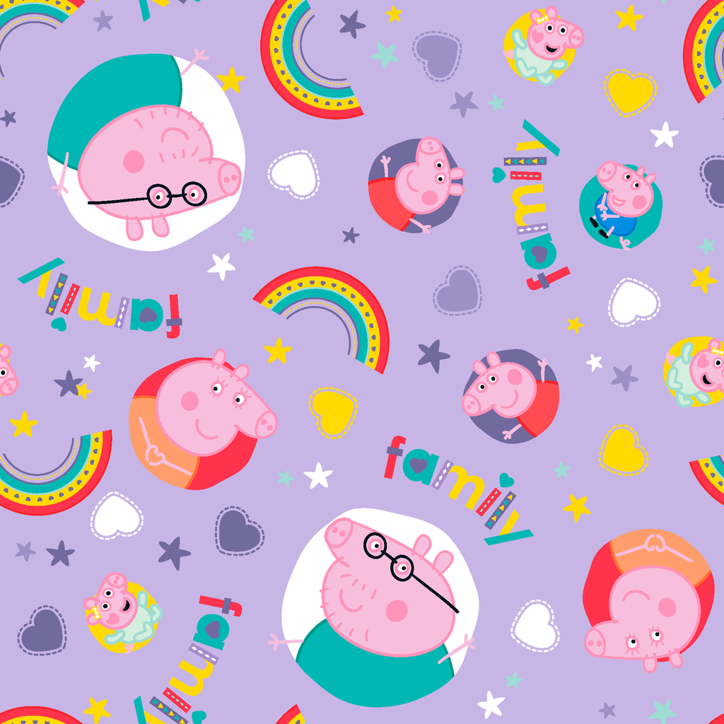 Adorable Hasbro Peppa Pig and family character on lavender with rainbows and stars. Perfect for children's apparel, featuring cute nursery motifs in vibrant colors.