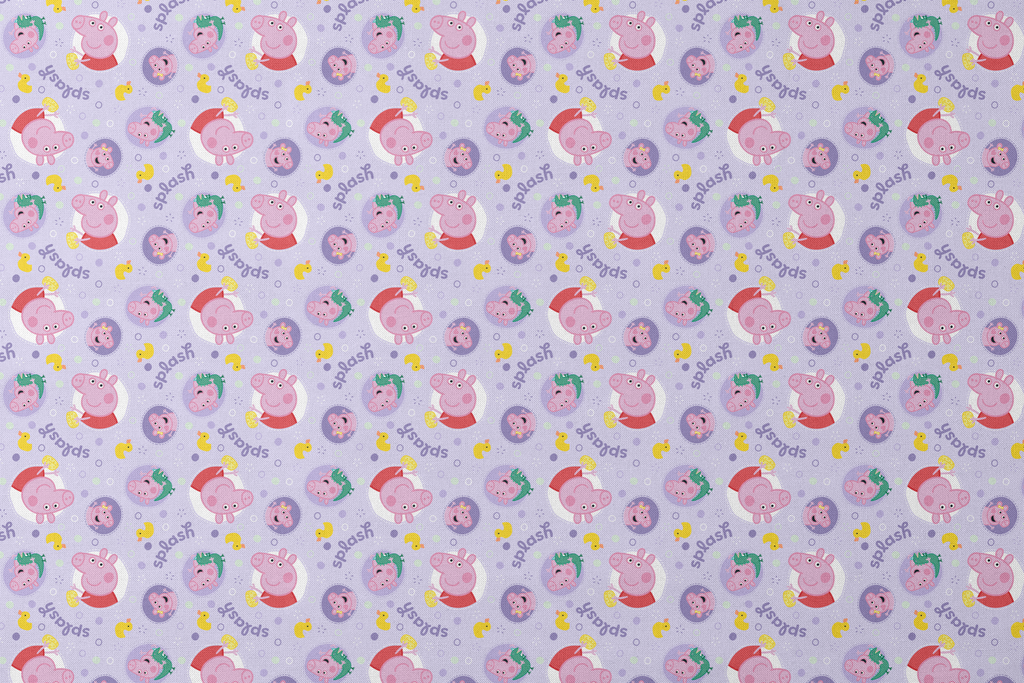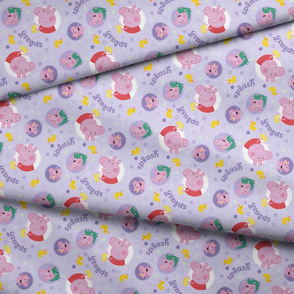 Adorable Hasbro Peppa Pig featuring character portraits on a lavender background with cute yellow ducks and playful splashes. Perfect for children's decor and apparel.