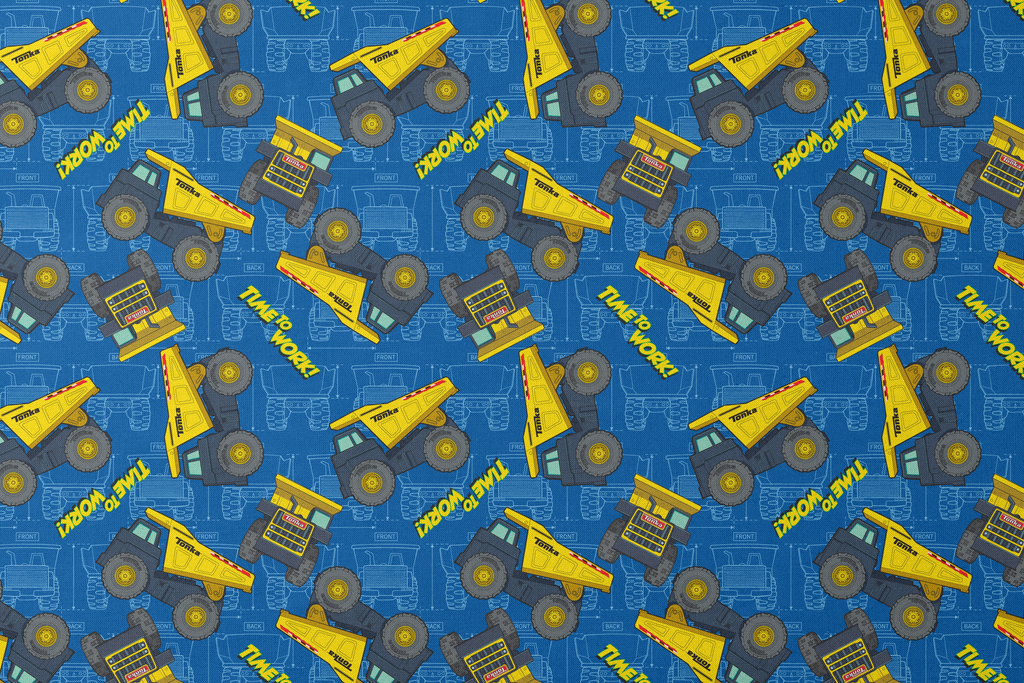 Hasbro Time to Work Yellow Construction Trucks on Blue Fabric