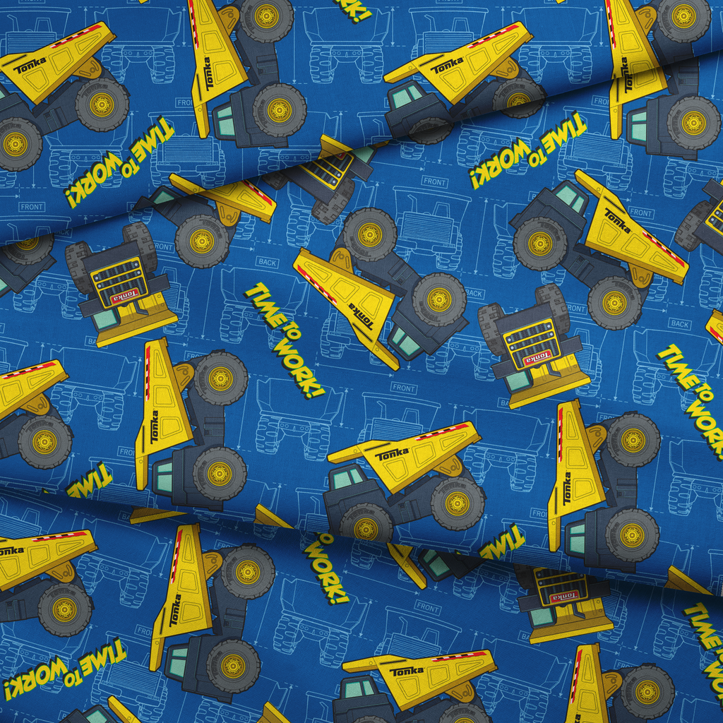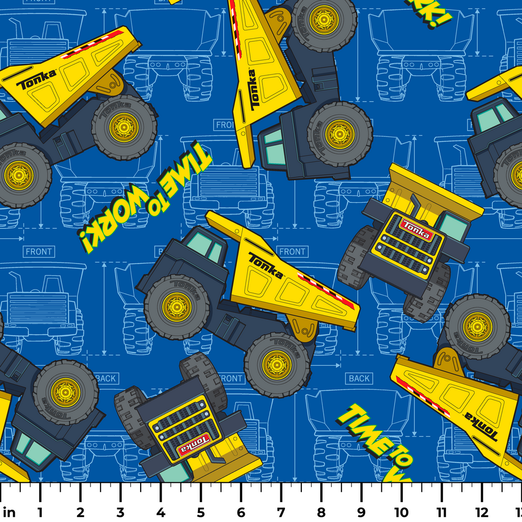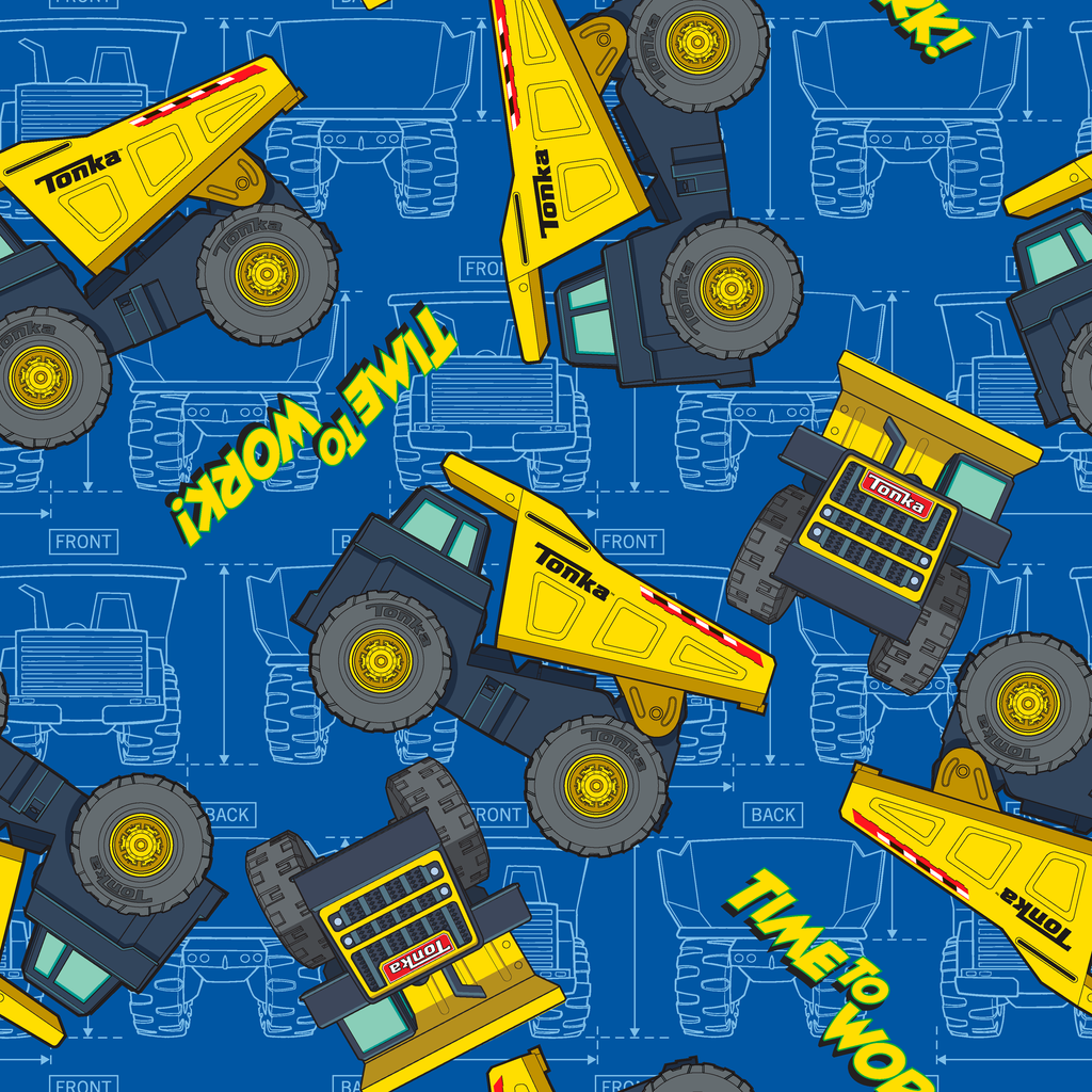 Vibrant yellow construction Hasbro Tonka vehicles on bright blue background with blueprint schematics - perfect for little builders and truck enthusiasts.
