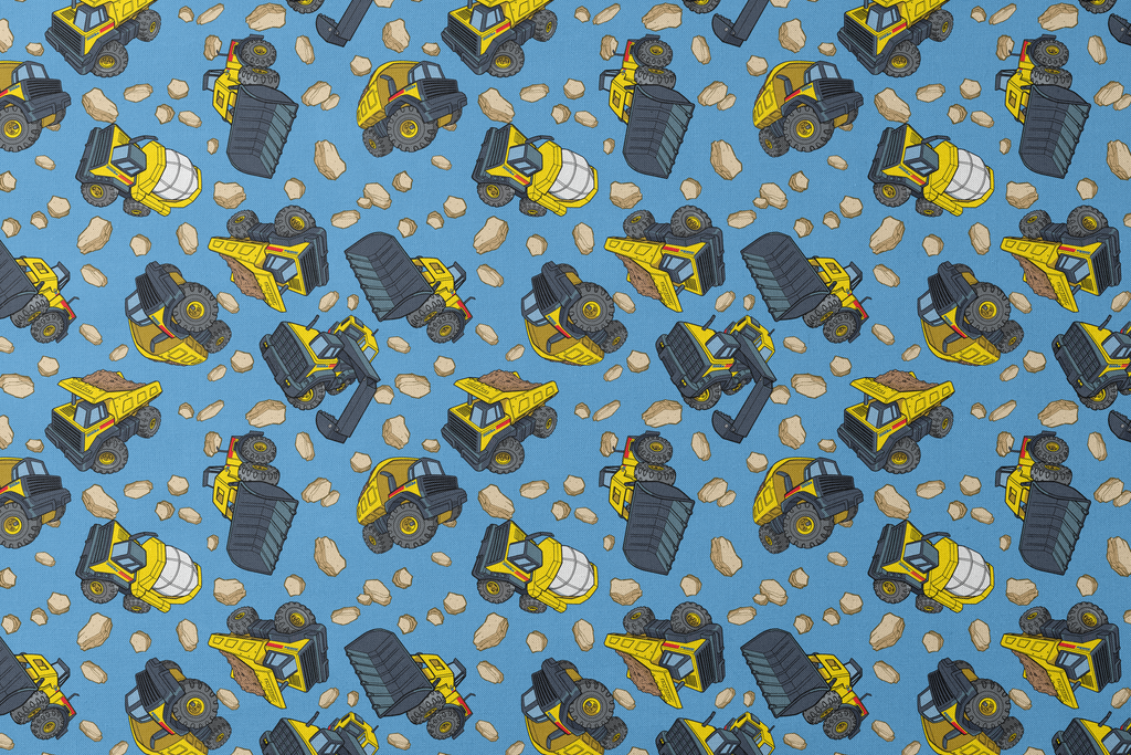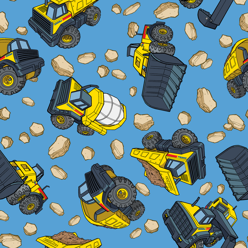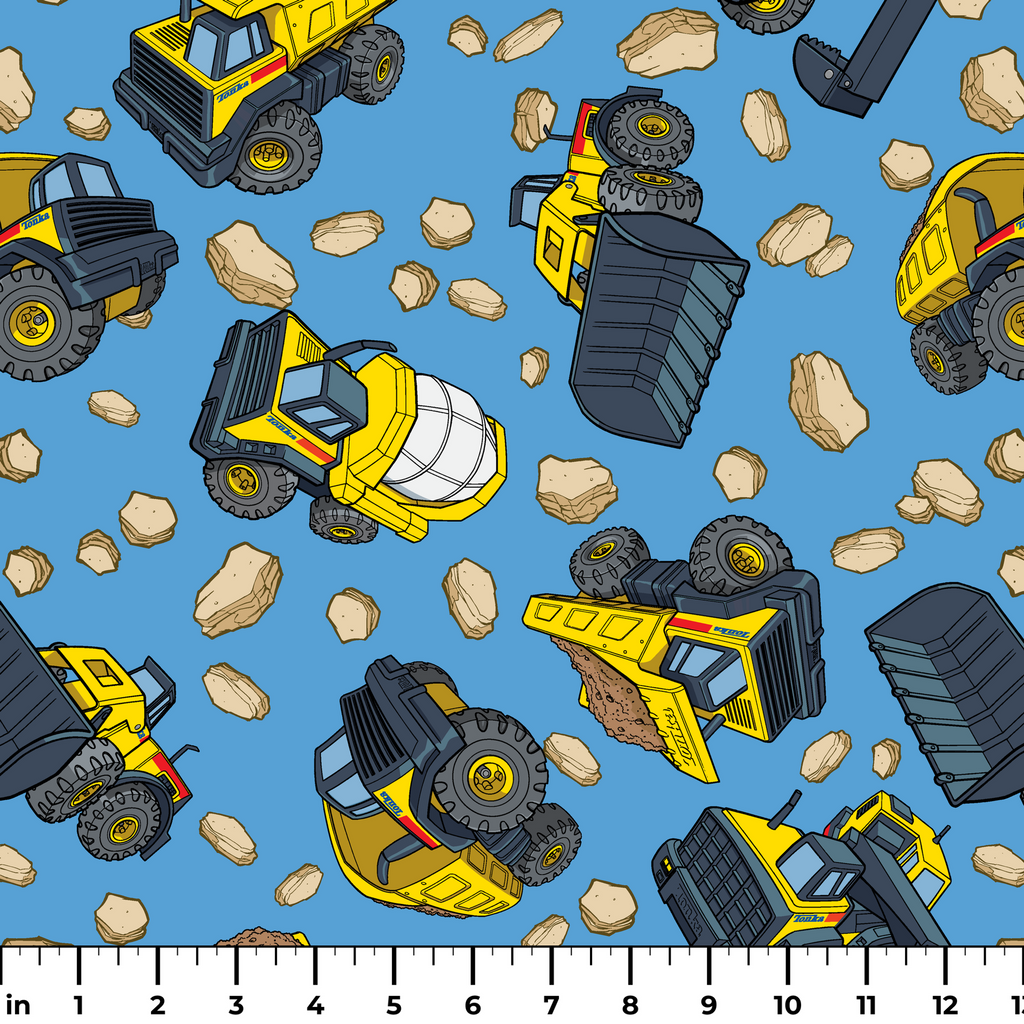 Hasbro Tonka construction vehicles pattern featuring yellow excavators, bulldozers and dump trucks against a bright blue background with scattered rocks and boulders. Perfect for kid's room decor or crafting projects.