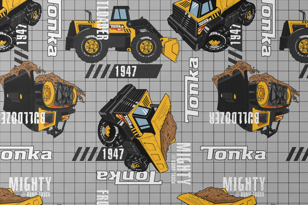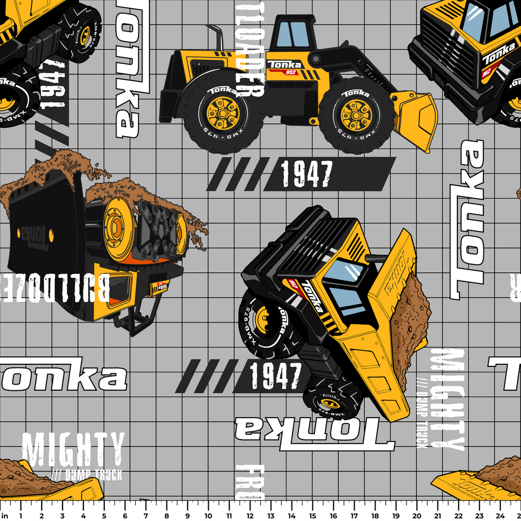 Bold Hasbro Tonka yellow construction vehicles on a gray grid background. Vintage Tonka truck graphics with "1947" and "mighty" text create a nostalgic, industrial pattern perfect for children's decor.
