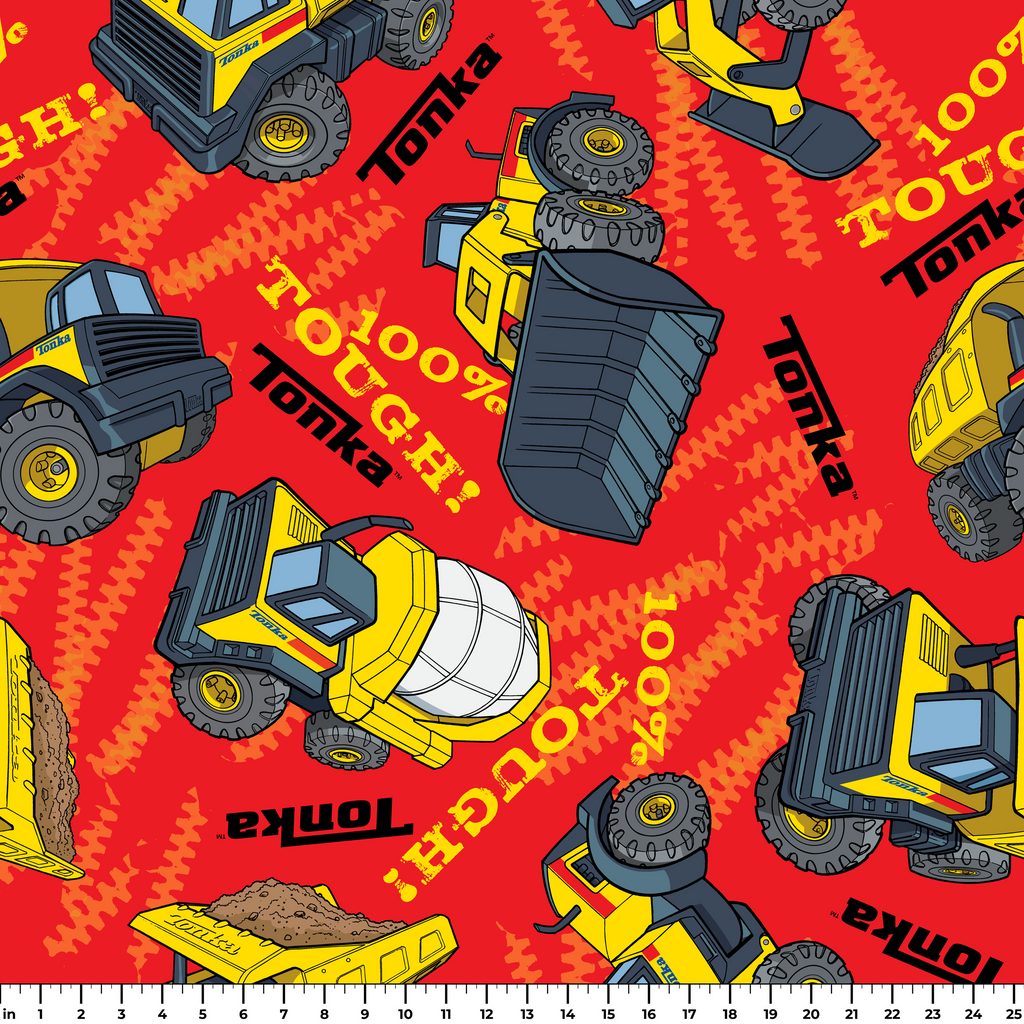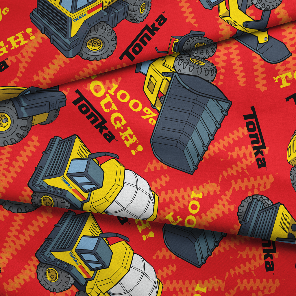 Colorful construction Hasbro Tonka pattern featuring yellow Tonka trucks, cement mixers, and excavators on a vibrant red background. Perfect for little builders and construction fans.