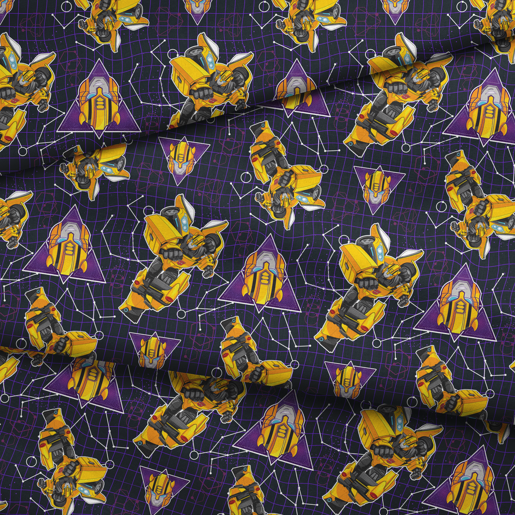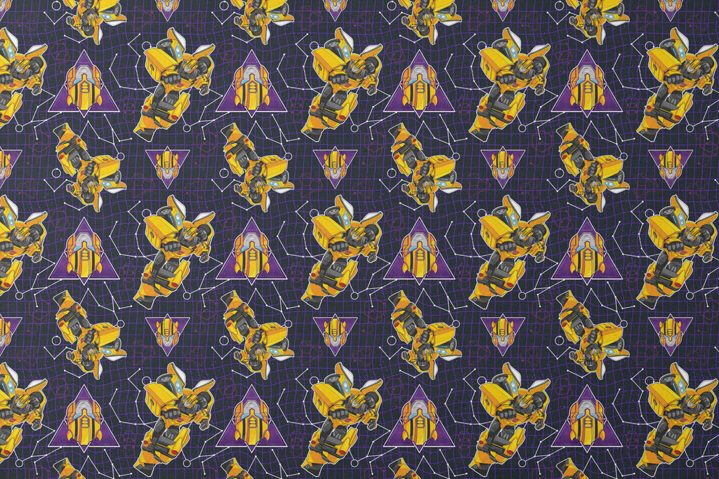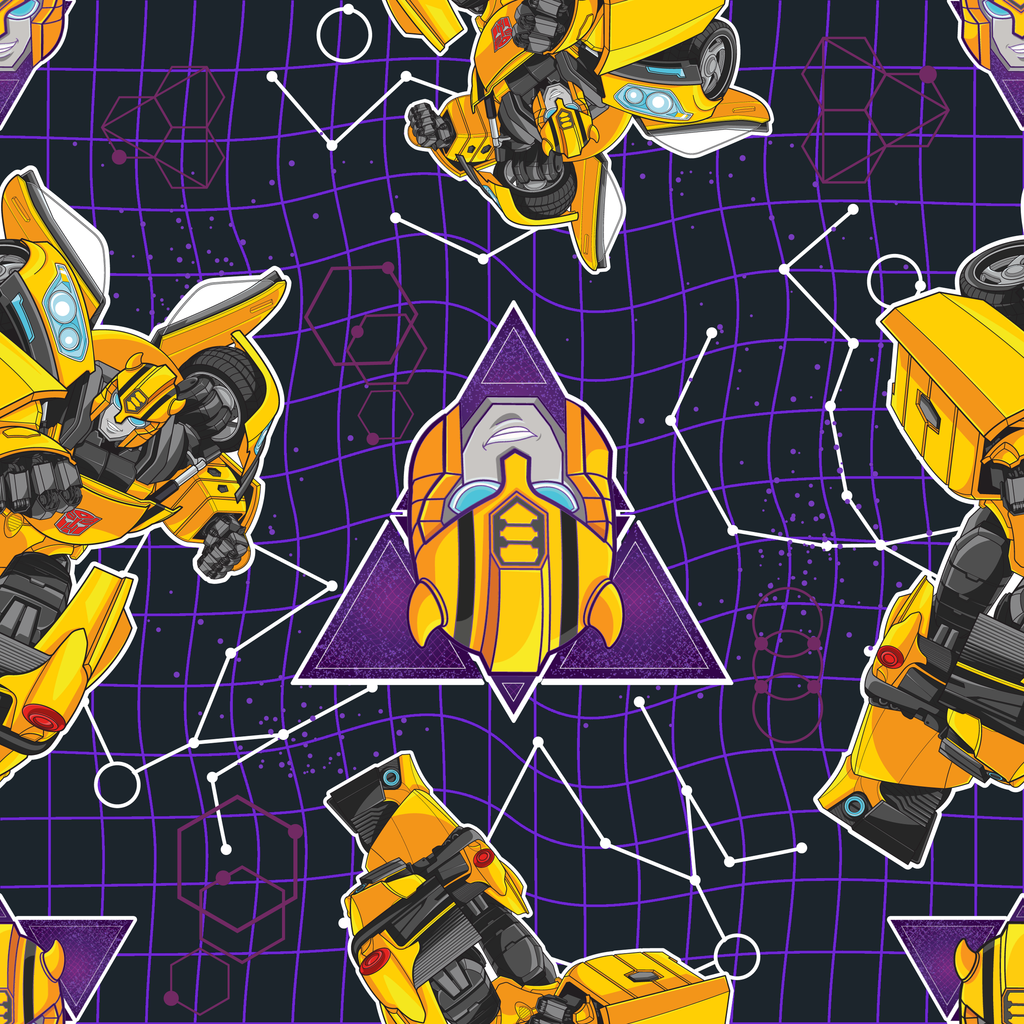 Vibrant yellow Hasbro Transformers robotic figures on a geometric purple grid. Perfect for kid's room decor or crafting projects.