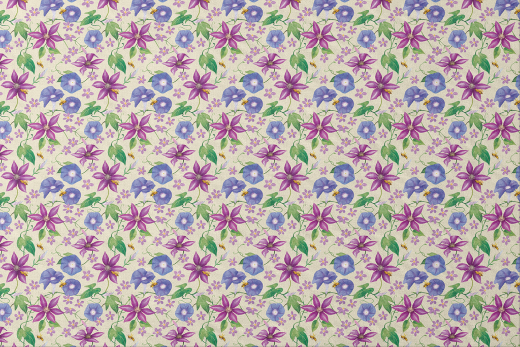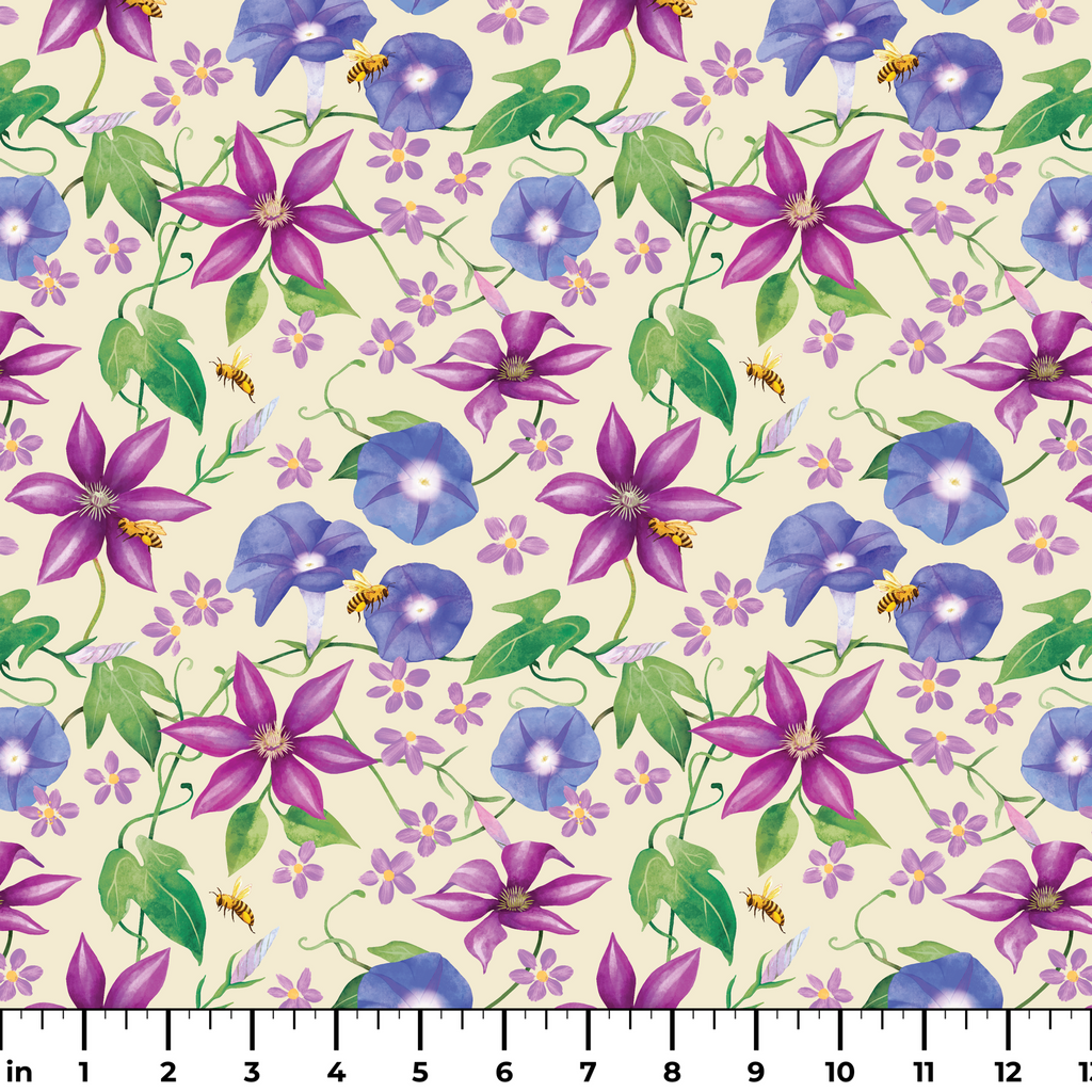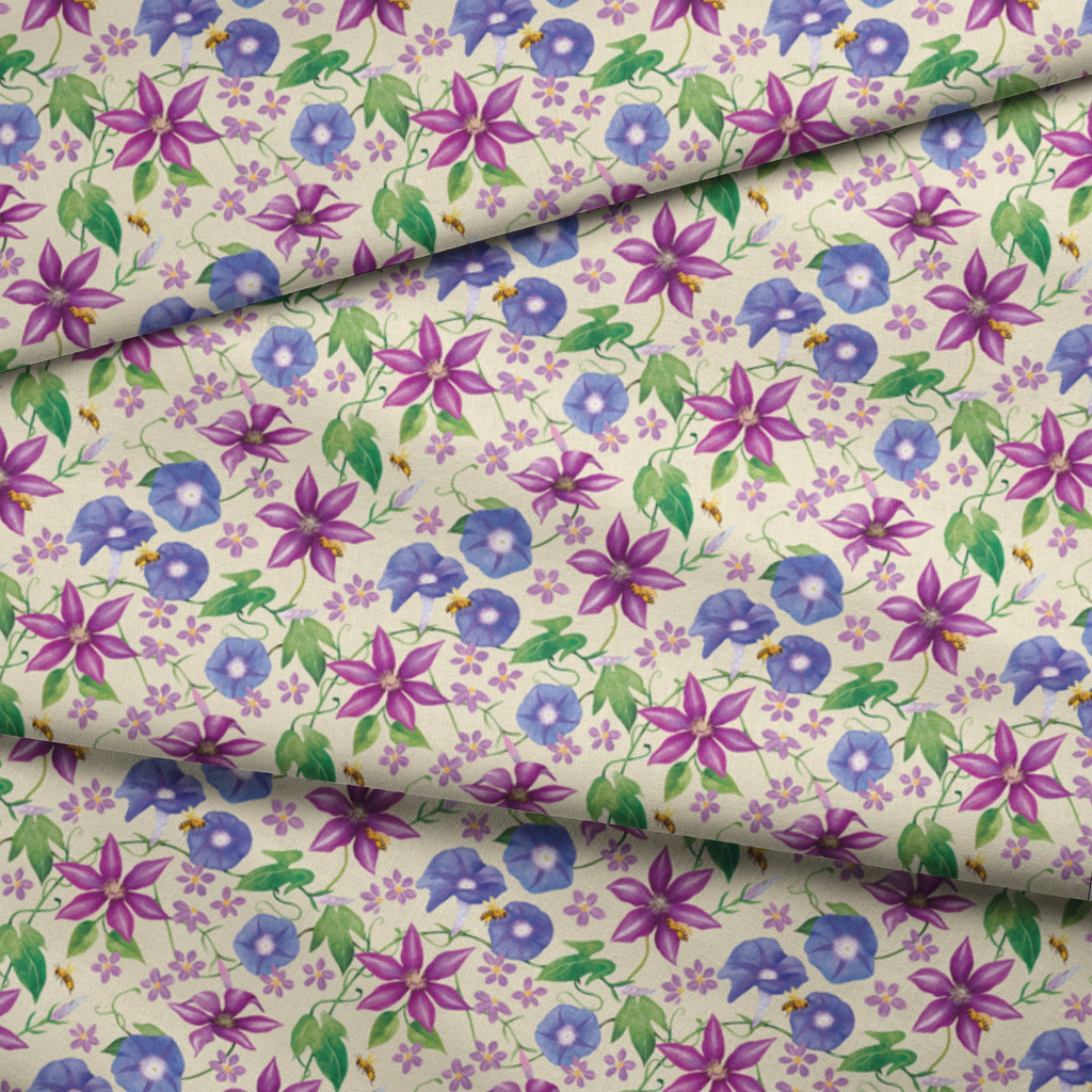 Dreamy watercolor clematis blooms in rich purple dance with periwinkle morning glories against a soft cream background. Delicate honeybees flit between the blossoms, while twining green vines and leaves create natural pathways throughout the design. This garden-inspired pattern would make stunning summer dresses or decorative pillows that bring a touch of cottage garden charm to any space.