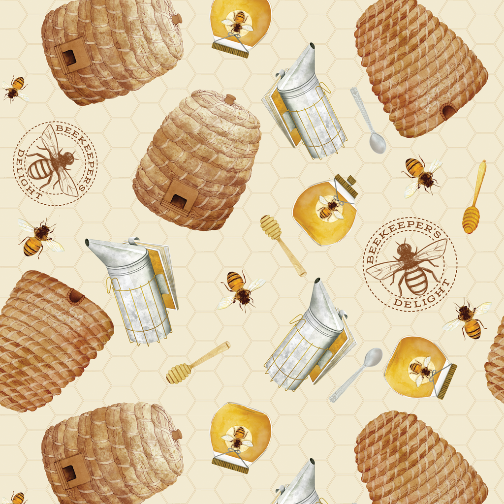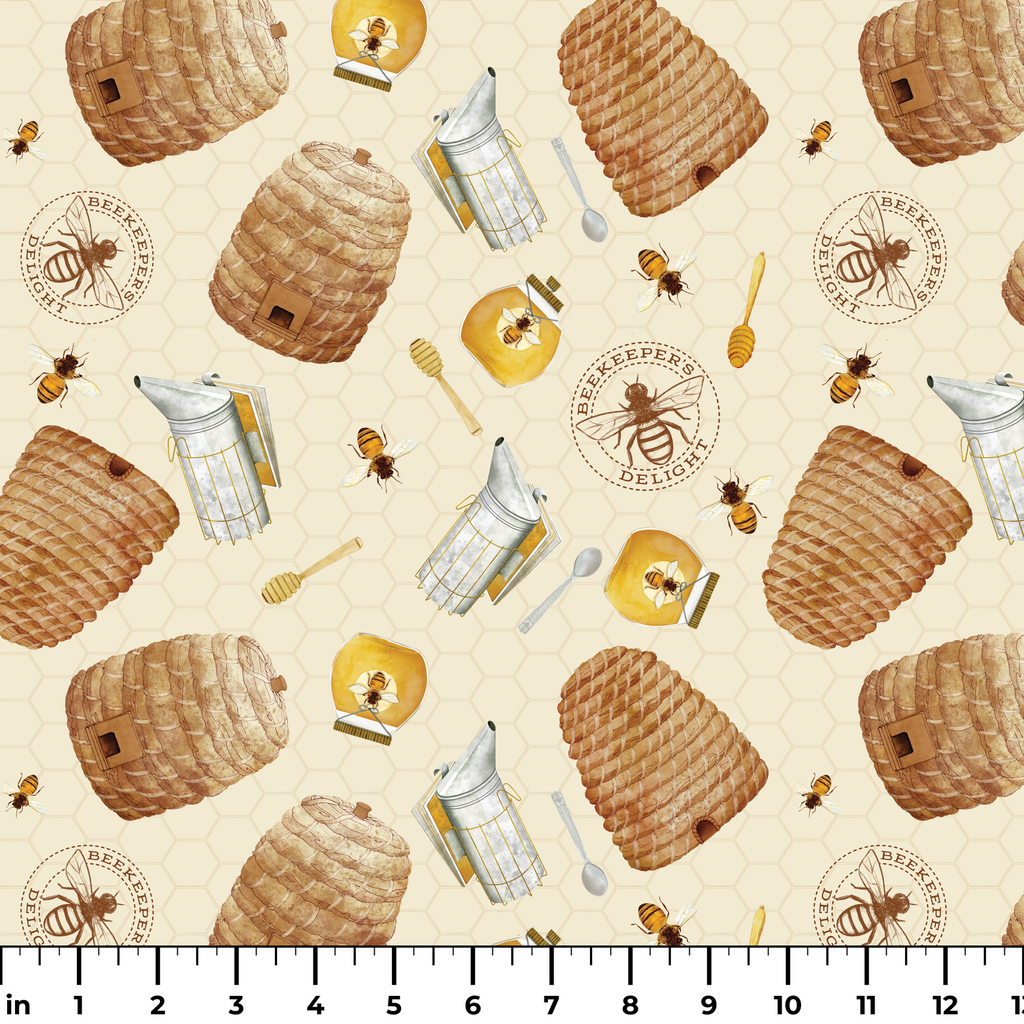 Delightful beekeeping imagery dances across a honeycomb-patterned cream background, featuring vintage-inspired woven skep hives, buzzing honeybees, metal smokers, and golden honey pots. Charming "Beekeeper's Delight" circular emblems stamp the fabric with rustic appeal, while wooden honey dippers add to the sweet theme. This fabric would make stunning kitchen accessories like aprons and tea towels, or create a buzz with delightful throw pillows for a country-inspired living space.