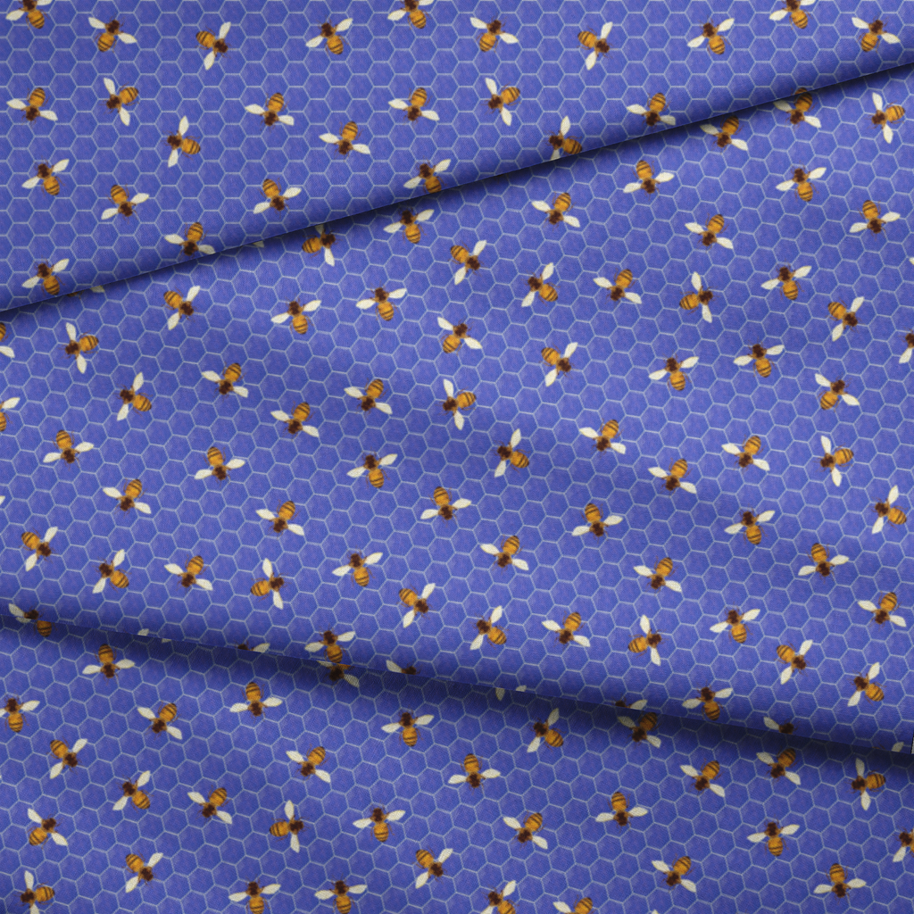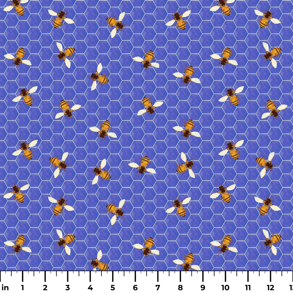 Buzzing with charm, this vibrant fabric features golden honeybees with translucent wings scattered across a rich cobalt blue background. The hexagonal honeycomb pattern cleverly enhances the bee theme, creating depth with its crisp white outlines against the textured blue. Perfect for spring and summer quilting projects or creating eye-catching accent pillows for a garden-inspired space. The realistic detail in each bee brings this nature-inspired design to life in a way that will have crafters swarming to create something special.