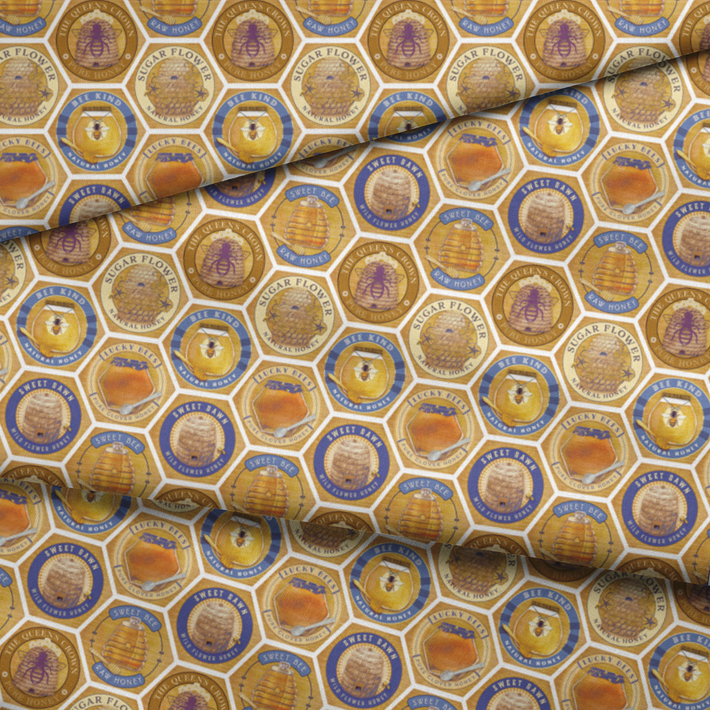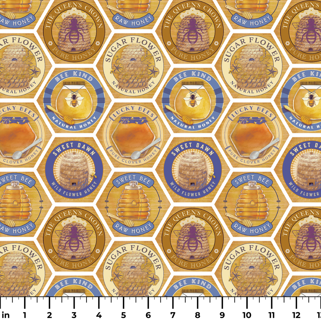 This charming honeycomb-patterned fabric showcases vintage-style honey labels in warm amber and golden tones accented with royal blue. Each hexagonal medallion features unique honey varieties like "The Queen's Crown," "Sugar Flower," and "Bee Kind," complete with beautifully illustrated beehives, honey pots, and buzzing bees. Perfect for kitchen projects like cafe curtains or tea towels, this sweet design would also make delightful quilting squares for a country-inspired throw.