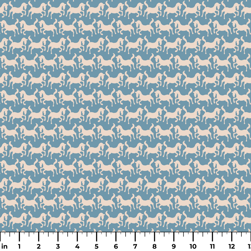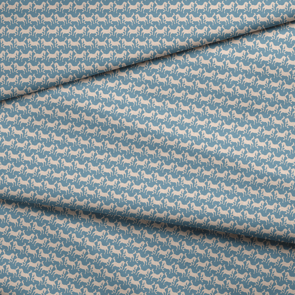 Vintage horse silhouette pattern in cream on slate blue background creates an elegant equestrian motif with a timeless, heritage appeal perfect for home decor or upholstery.