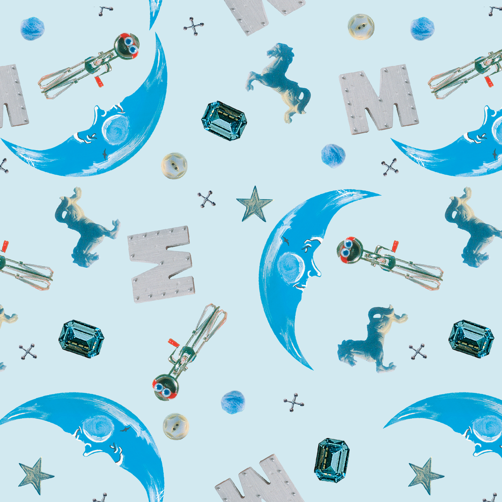 A whimsical I Spy toss design featuring blue and silver fantasy objects on a light blue background. Perfect for nurseries and children's rooms.