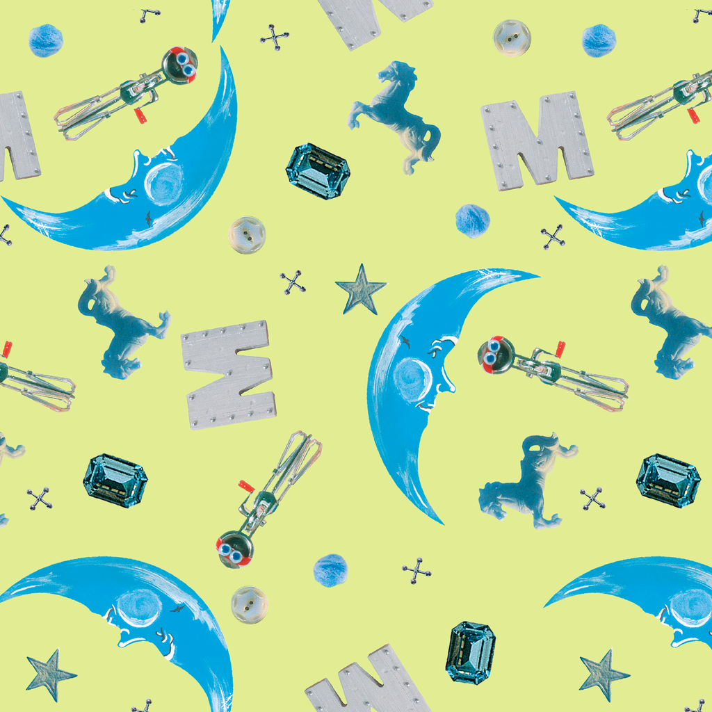 A whimsical I Spy toss design featuring blue and silver fantasy objects on a light green background. Perfect for nurseries or childrens' rooms.