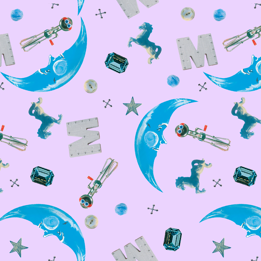 A whimsical I Spy toss featuring blue and silver fantasy objects on a purple background. Perfect for nurseries or children's rooms.