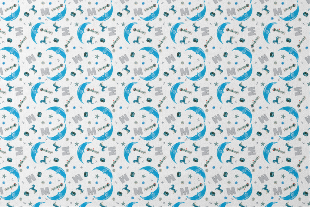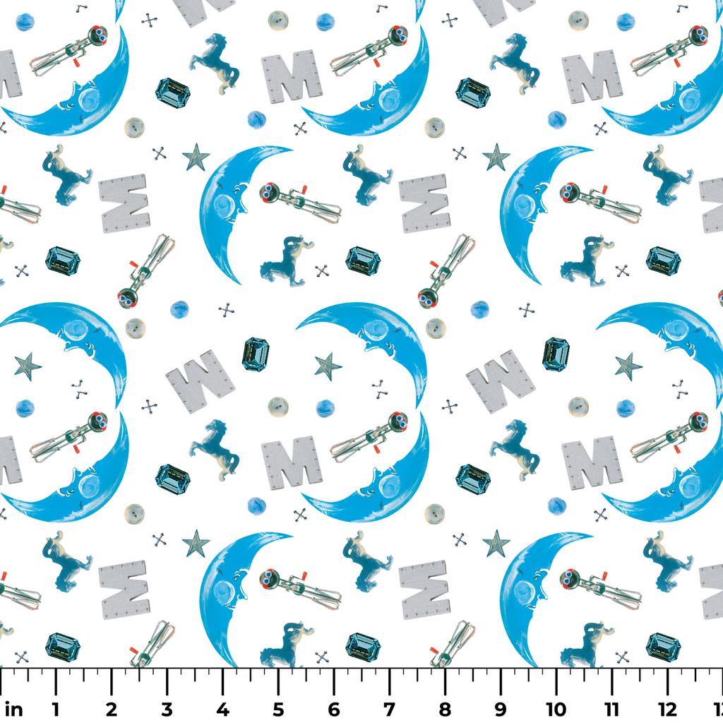A whimsical I Spy toss design featuring blue and silver fantasy object on a white background. Perfect for nursery decor or children's crafting projects.