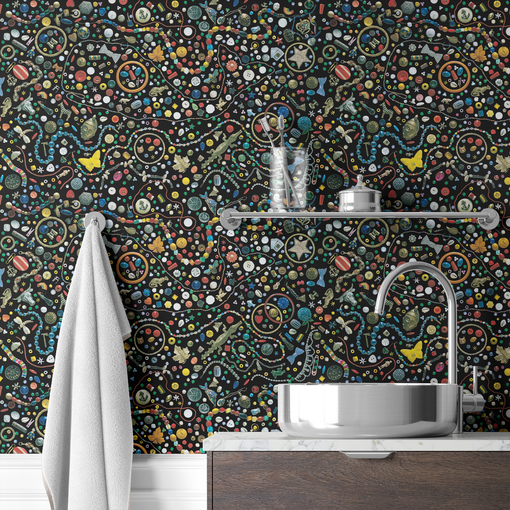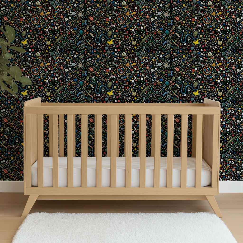 A vibrant I Spy illustration pattern featuring colorful everyday objects on a black background. Perfect for any space.