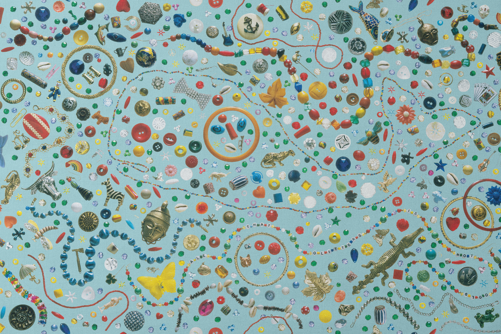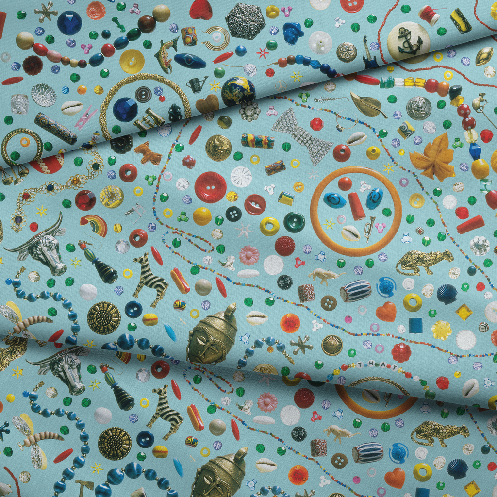A vibrant I Spy illustration pattern featuring colorful everyday objects on a teal background. Perfect for craft projects or home decor.