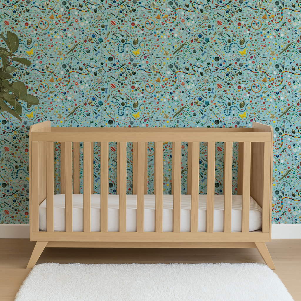 A vibrant I Spy illustration pattern featuring colorful everyday objects on a teal background. Perfect for any space.