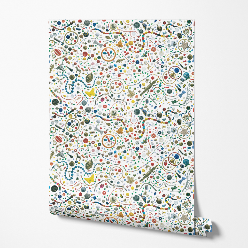 A vibrant I Spy illustration pattern featuring colorful everyday objects on a white background. Perfect for any space.
