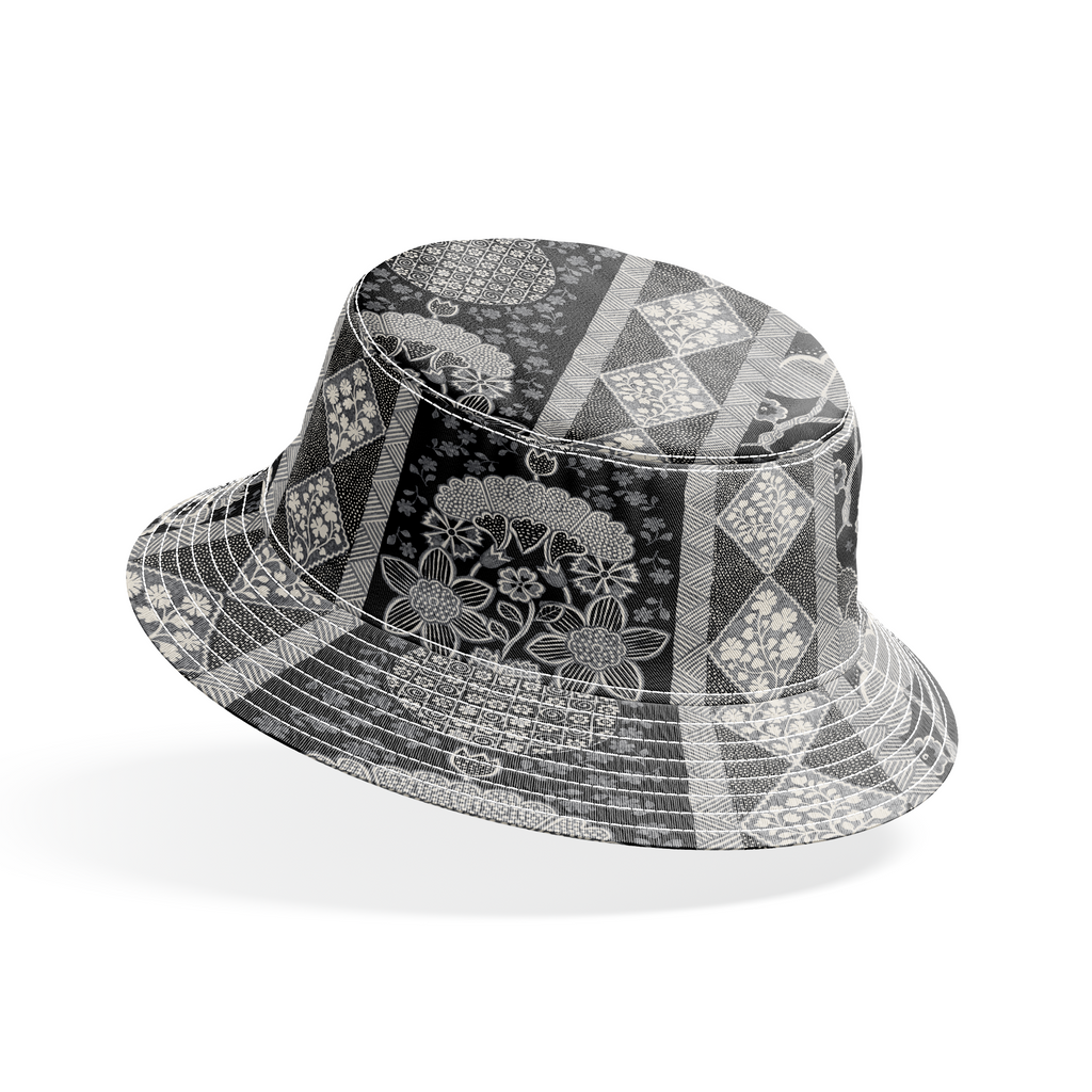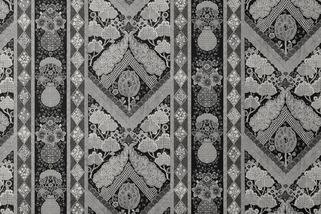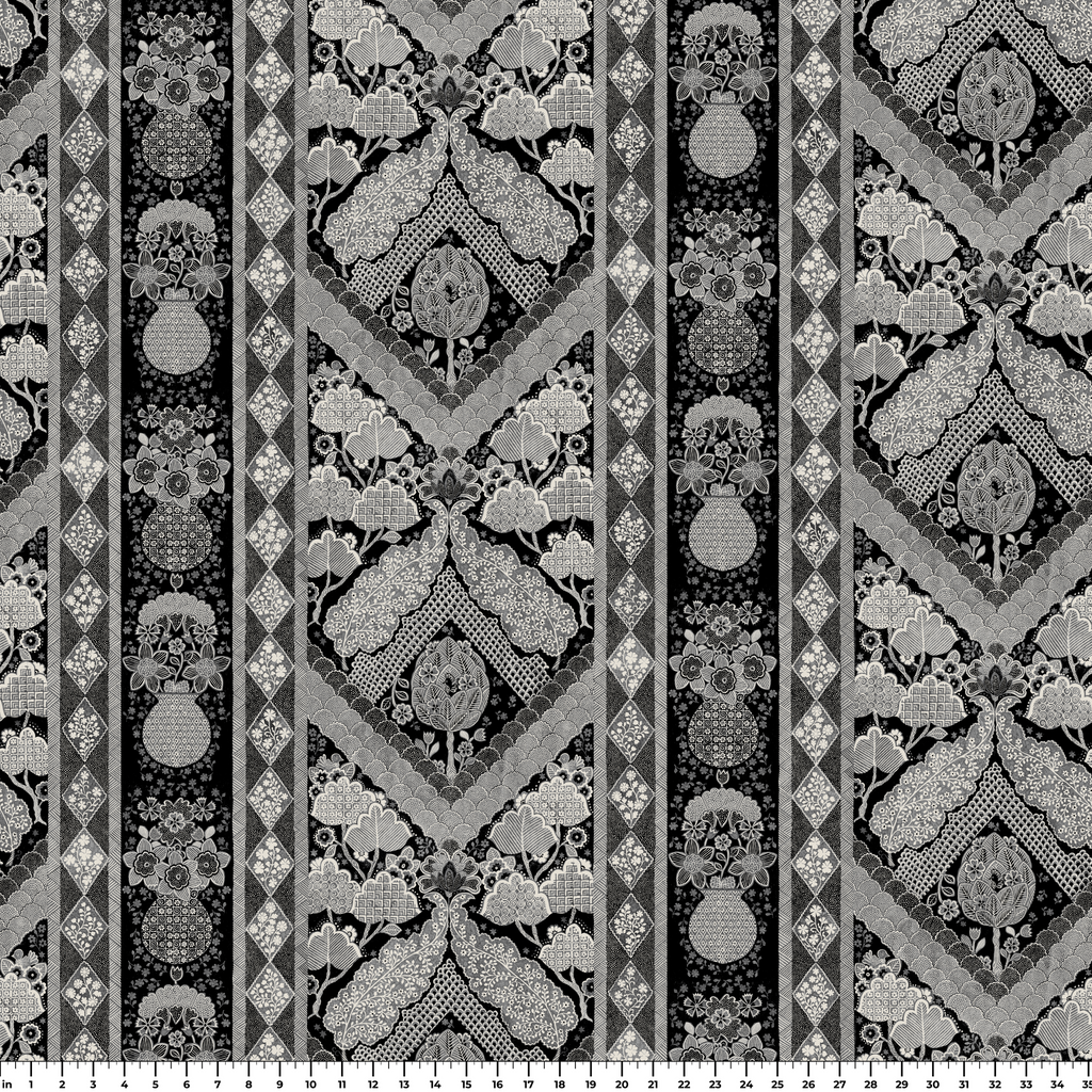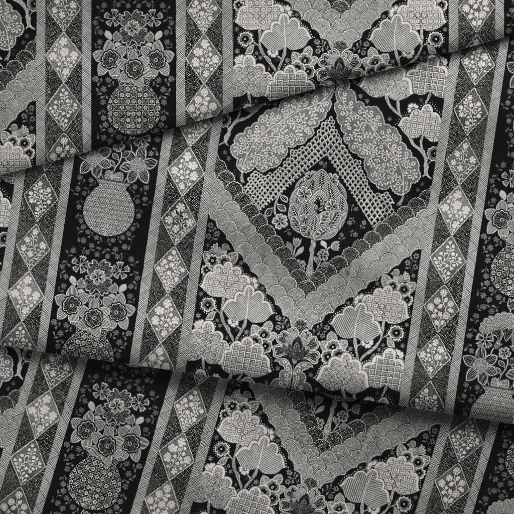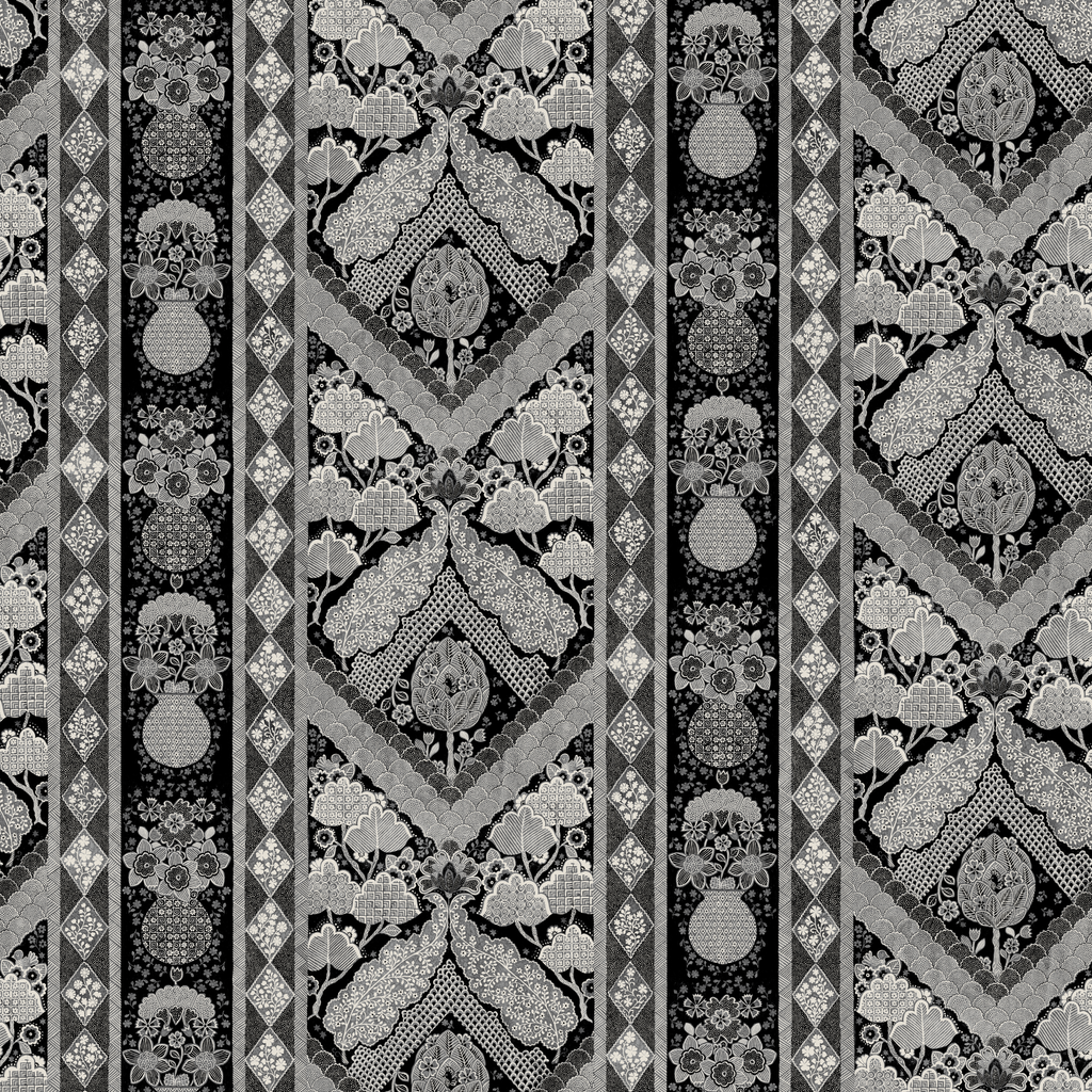 Vintage black and white pattern featuring intricate paisley motifs and geometric diamond borders in a traditional western heritage style.