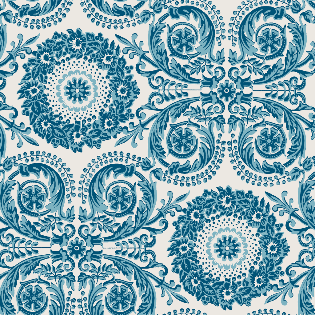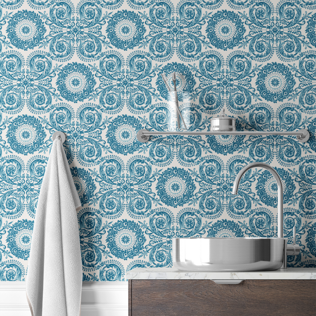 Elegant blue medallion pattern featuring intricate paisley swirls and bohemian circular motifs on a white background, perfect for home decor.