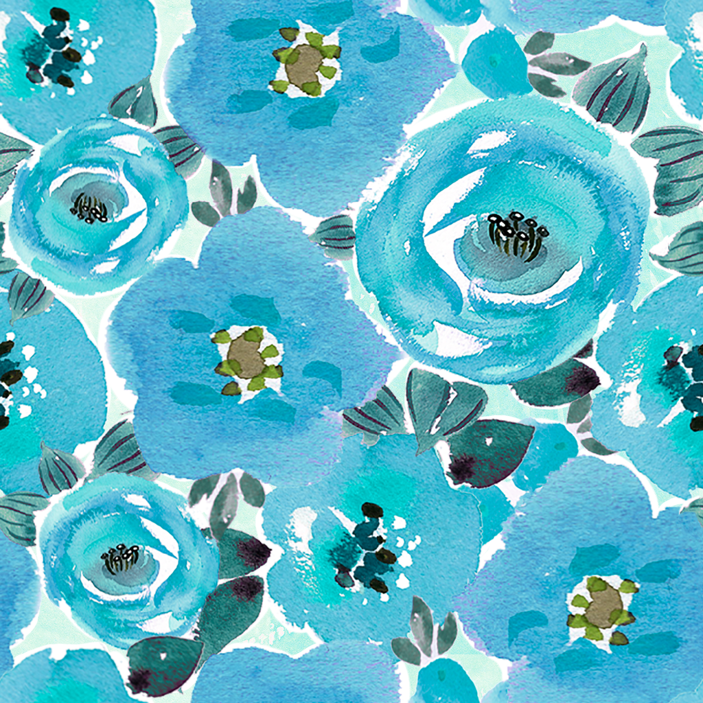 This watercolor floral showcases vibrant turquoise blue roses with delicate gray foliage and teal accents on a soft background, creating a fresh and modern aesthetic.