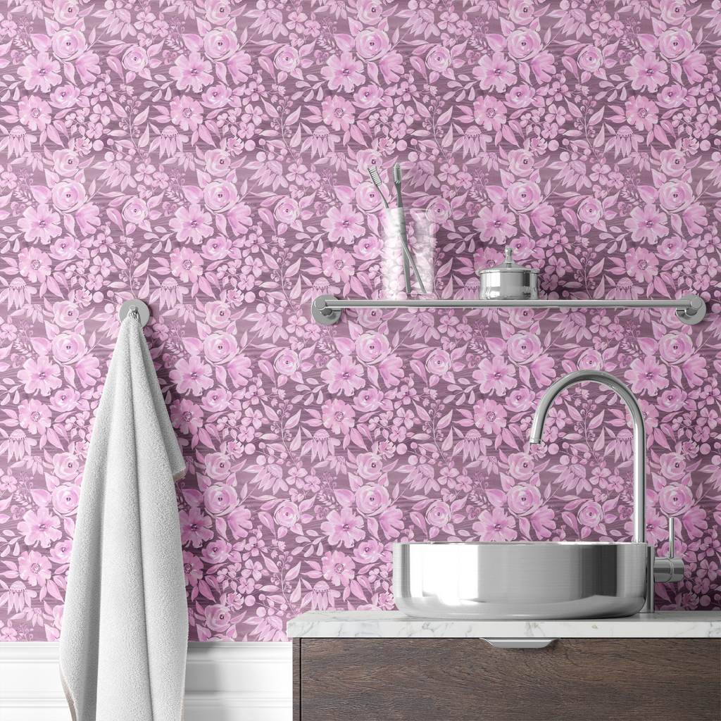 Delicate purple watercolor florals bloom across a dusty purple background, creating a romantic garden-inspired pattern perfect for any space.