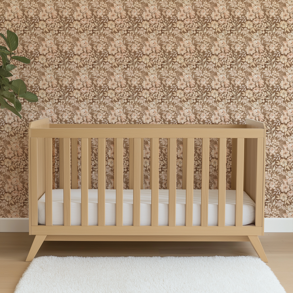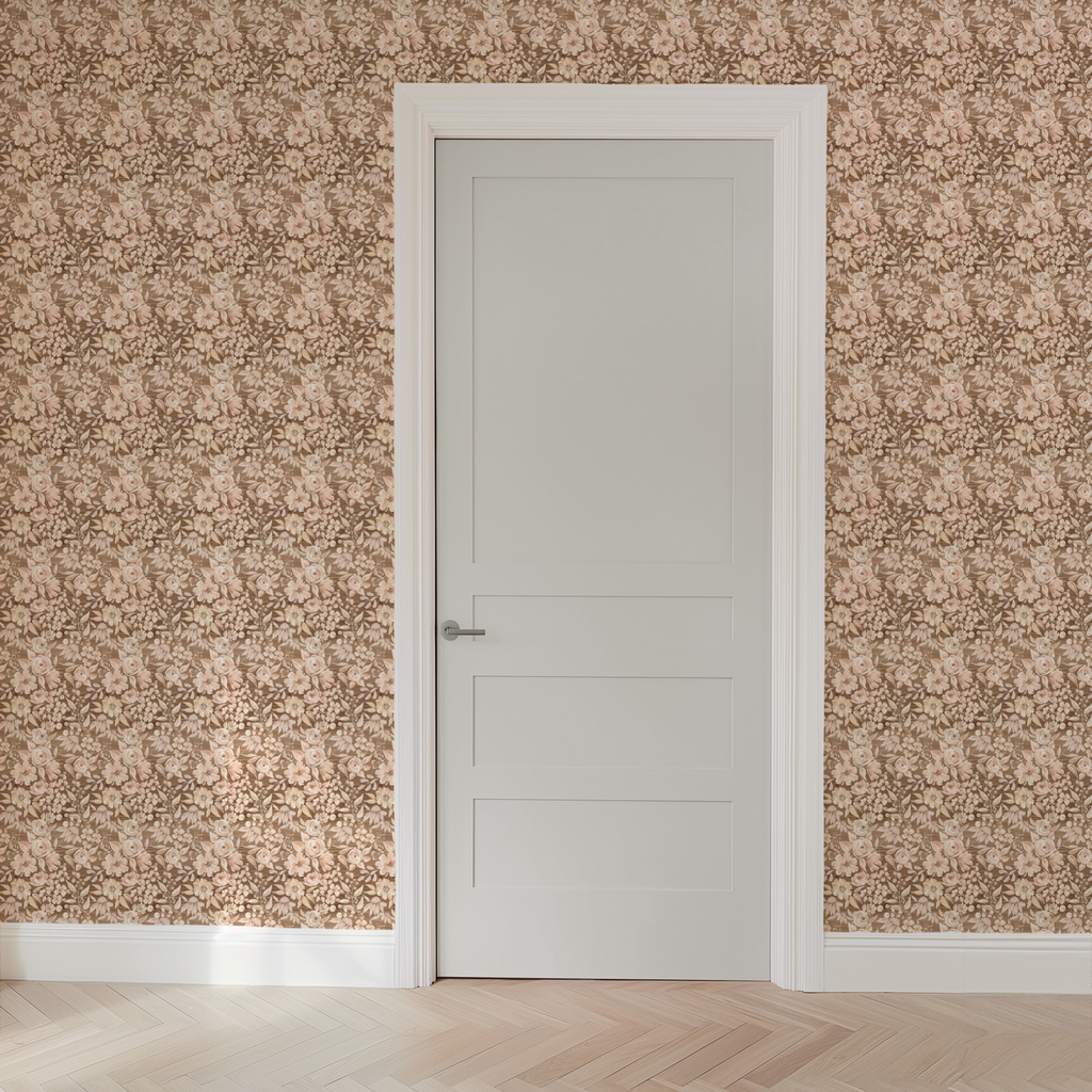This elegant floral pattern features soft tan and cream blooms with delicate leaves on a warm brown background, creating a timeless vintage aesthetic perfect for any space.