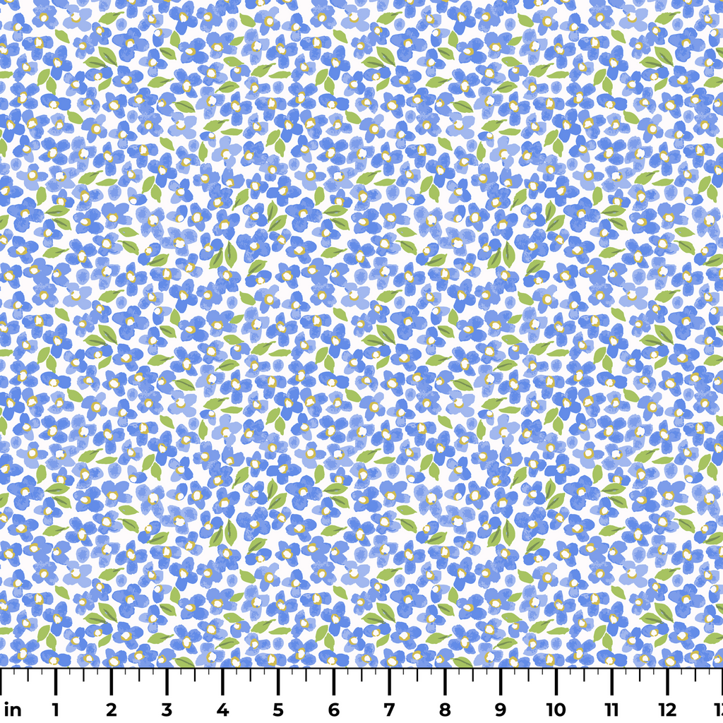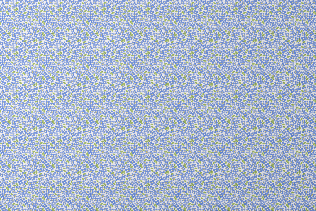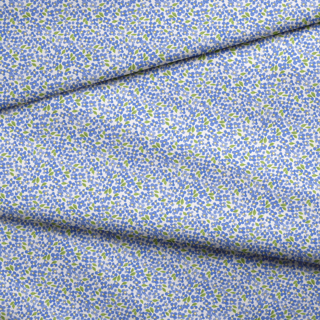 This charming floral pattern features delicate blue forget-me-nots with tiny yellow centers scattered across a white background, accented by fresh green leaves for a sweet spring-inspired design.