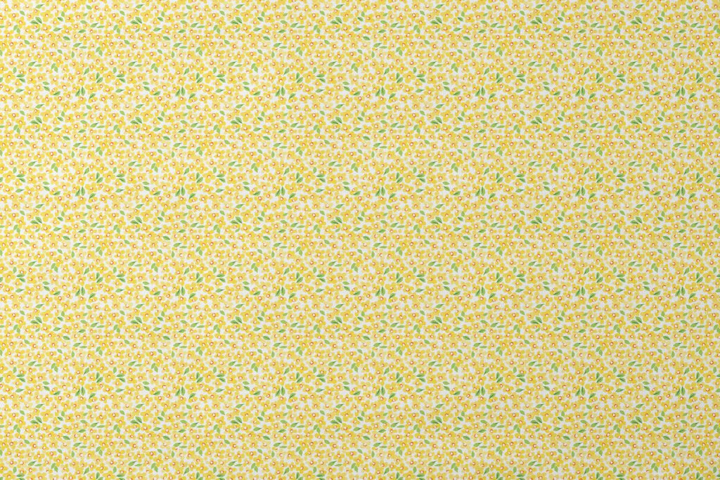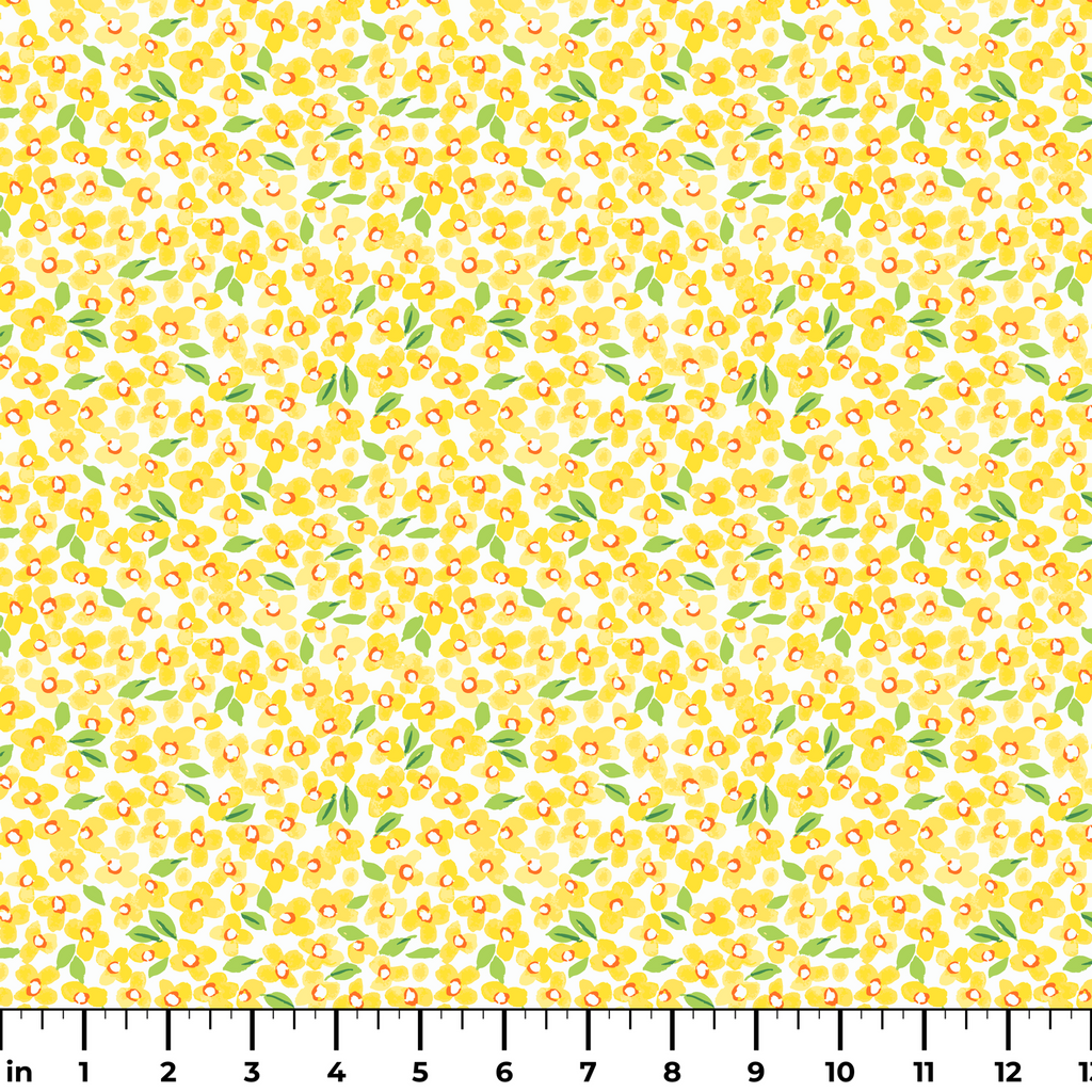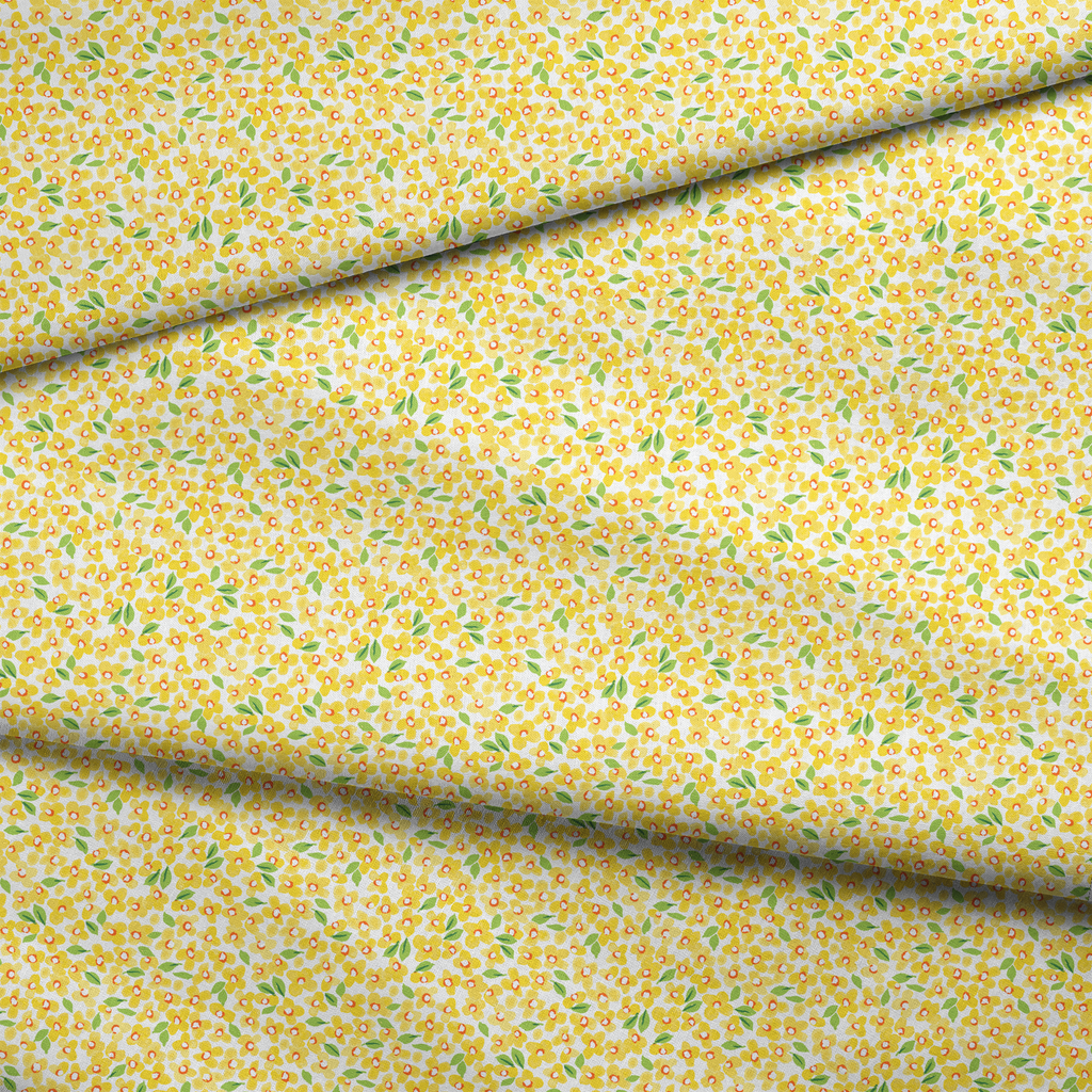 Cheerful yellow petite florals create a whimsical floral pattern with green leaves on a white background, perfect for a fresh spring or summer look to any project.