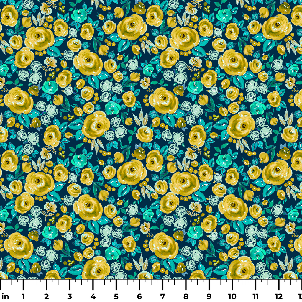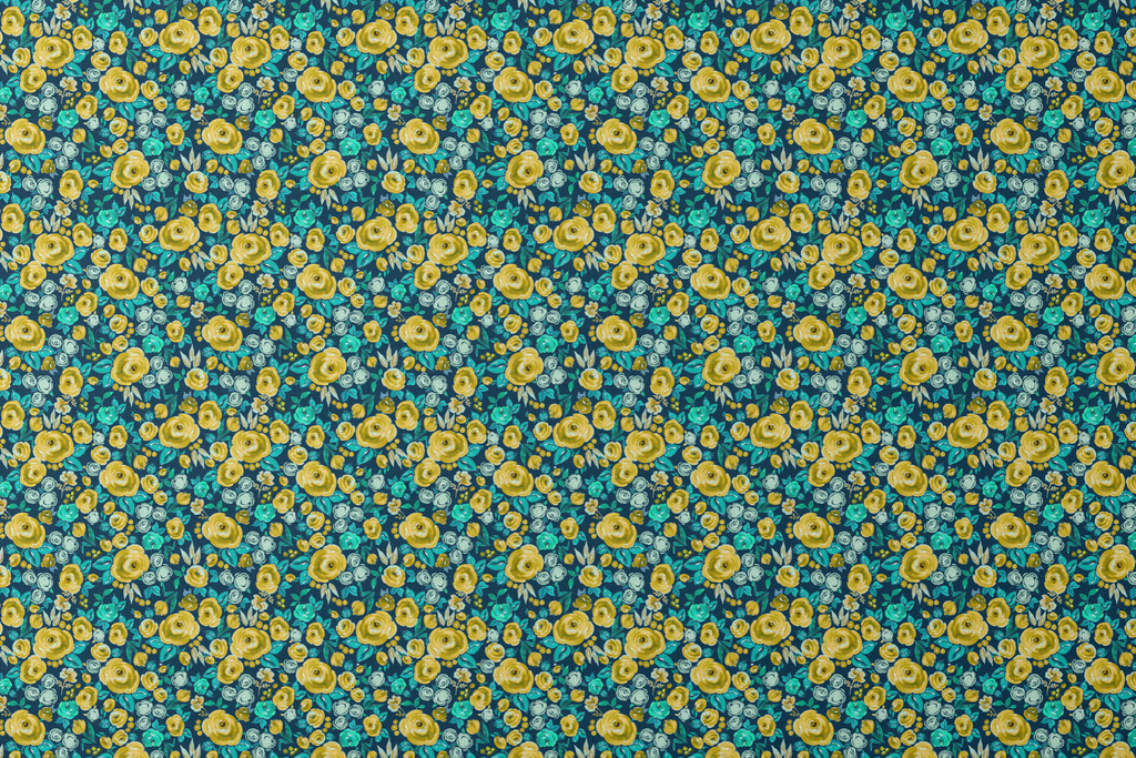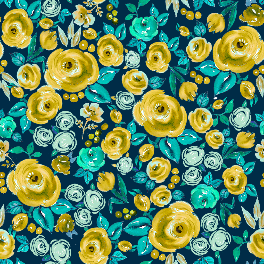 Vibrant yellow and turquoise watercolor floral pattern featuring golden roses and teal blooms on a deep navy background, creating a colorful botanical design.