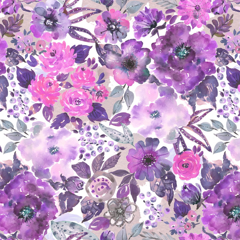 Delicate watercolor floral jewel garden pattern featuring purple and pink blossoms, perfect for a romantic garden-inspired feel for any space.