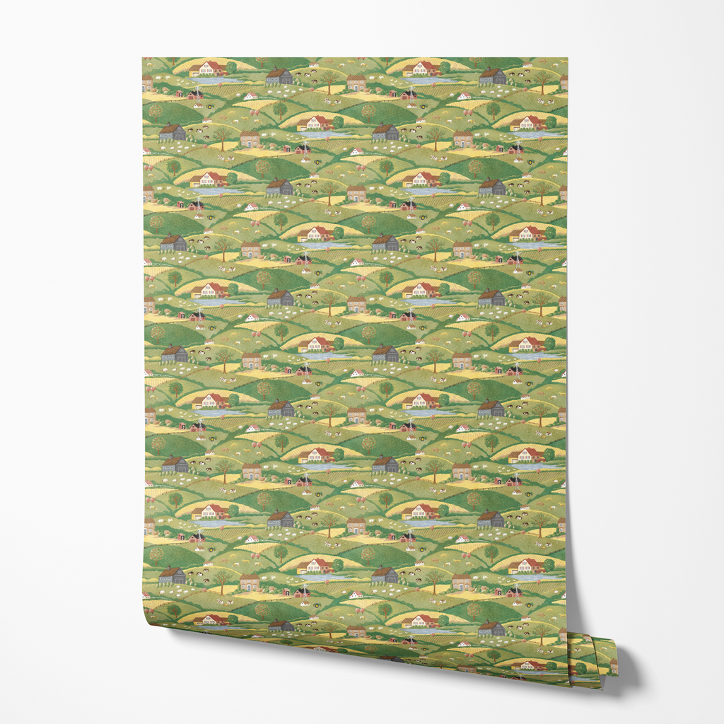 Charming John Deere countryside scene with rolling green hills, quaint farmhouses, and grazing sheep. This art pastoral landscape pattern features barns, windmills, and winding streams in a whimsical, traditional style.