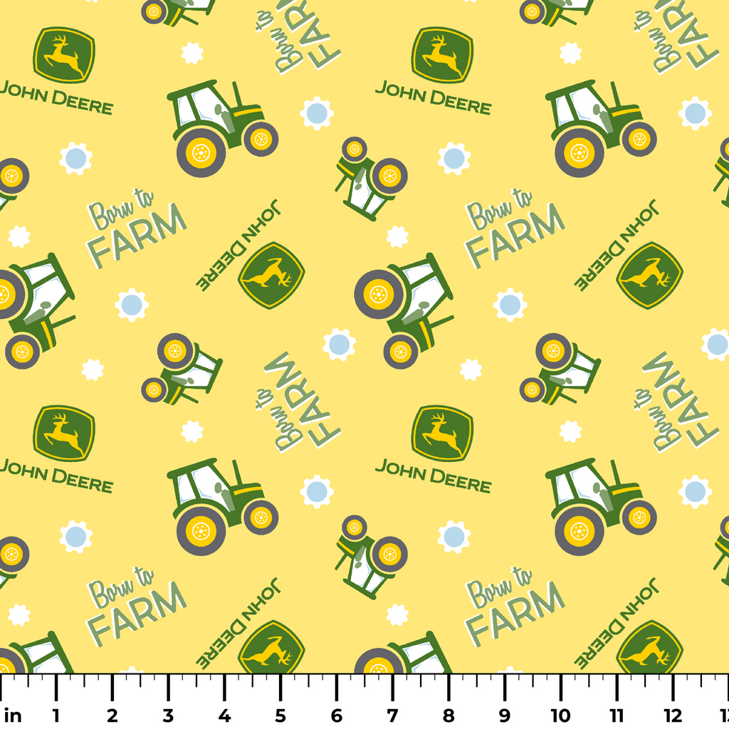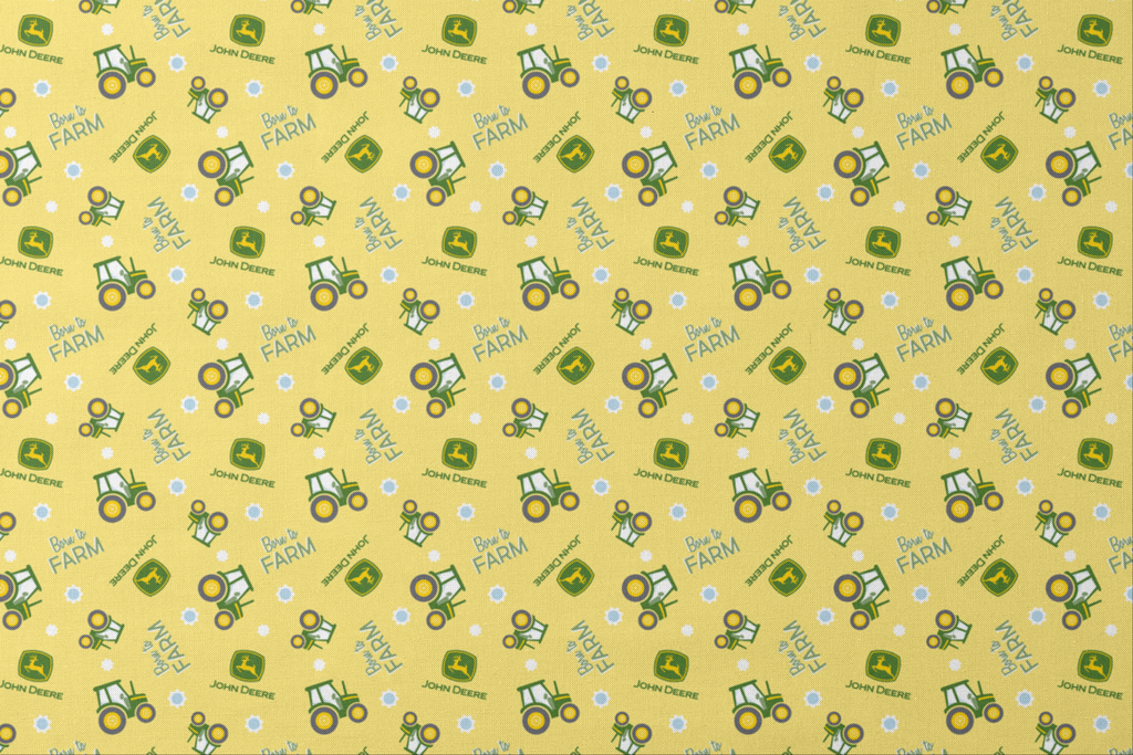 Cheerful green tractors scatter across a sunny yellow background in this officially licensed John Deere fabric. The iconic deer logo, "Born to FARM" phrases, and decorative gears create a playful farm-themed pattern perfect for little ones who dream of the agricultural life. This print would make adorable quilts, pillowcases, or curtains for a nursery, or transform it into a special birthday outfit for your budding farmer.