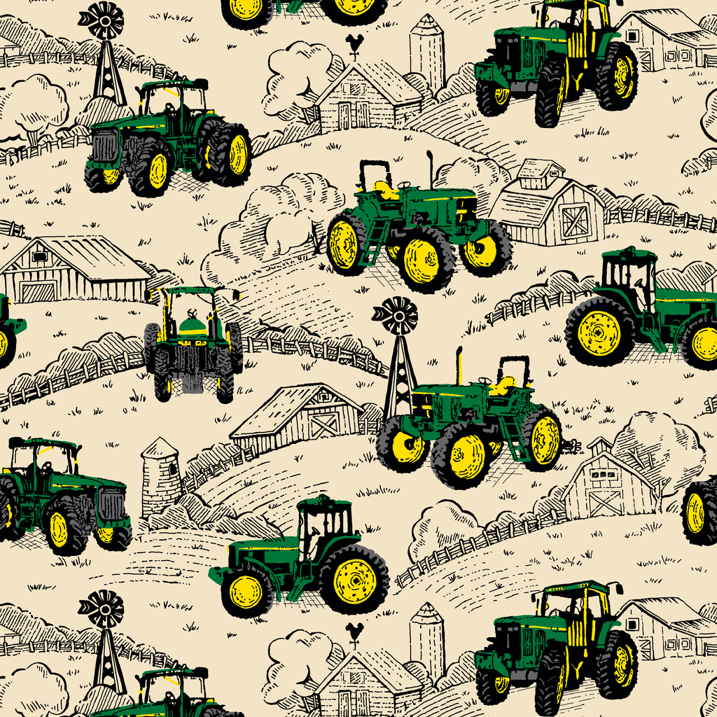 Vintage John Deere farm scene fabric featuring green and yellow tractors against a cream background with hand-drawn rural landscapes, windmills, barns, and countryside elements - perfect for quilting projects.