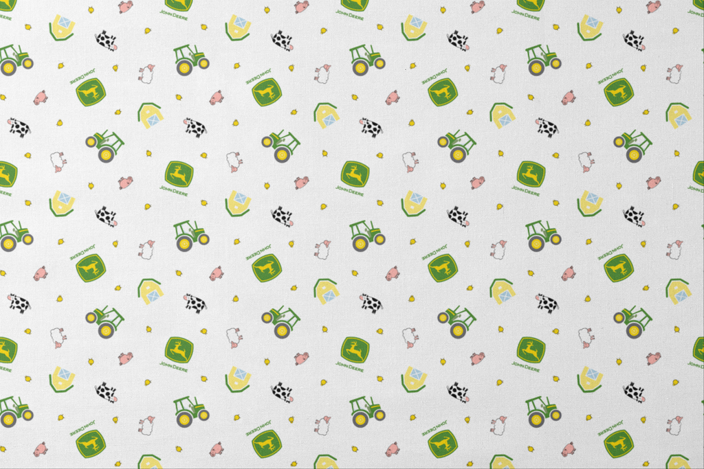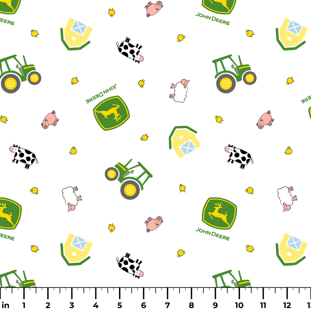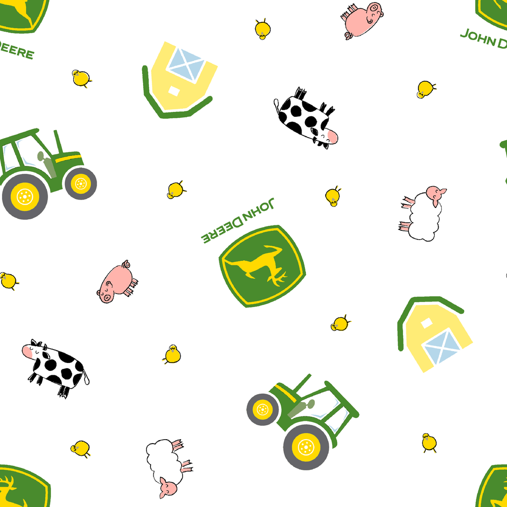 This charming farm-themed fabric features iconic John Deere green tractors with bright yellow wheels scattered across a crisp white background. Playfully illustrated farm animals including spotted cows, fluffy sheep, and pink pigs are joined by yellow chicks and quaint yellow barns. Perfect for creating children's quilts, nursery accessories, or farm-themed tote bags that will delight any little tractor enthusiast.